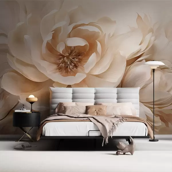 Фототапет Кремообразни божури с кафяви центрове и листа на размазан светъл абстрактен фон Nr w09554