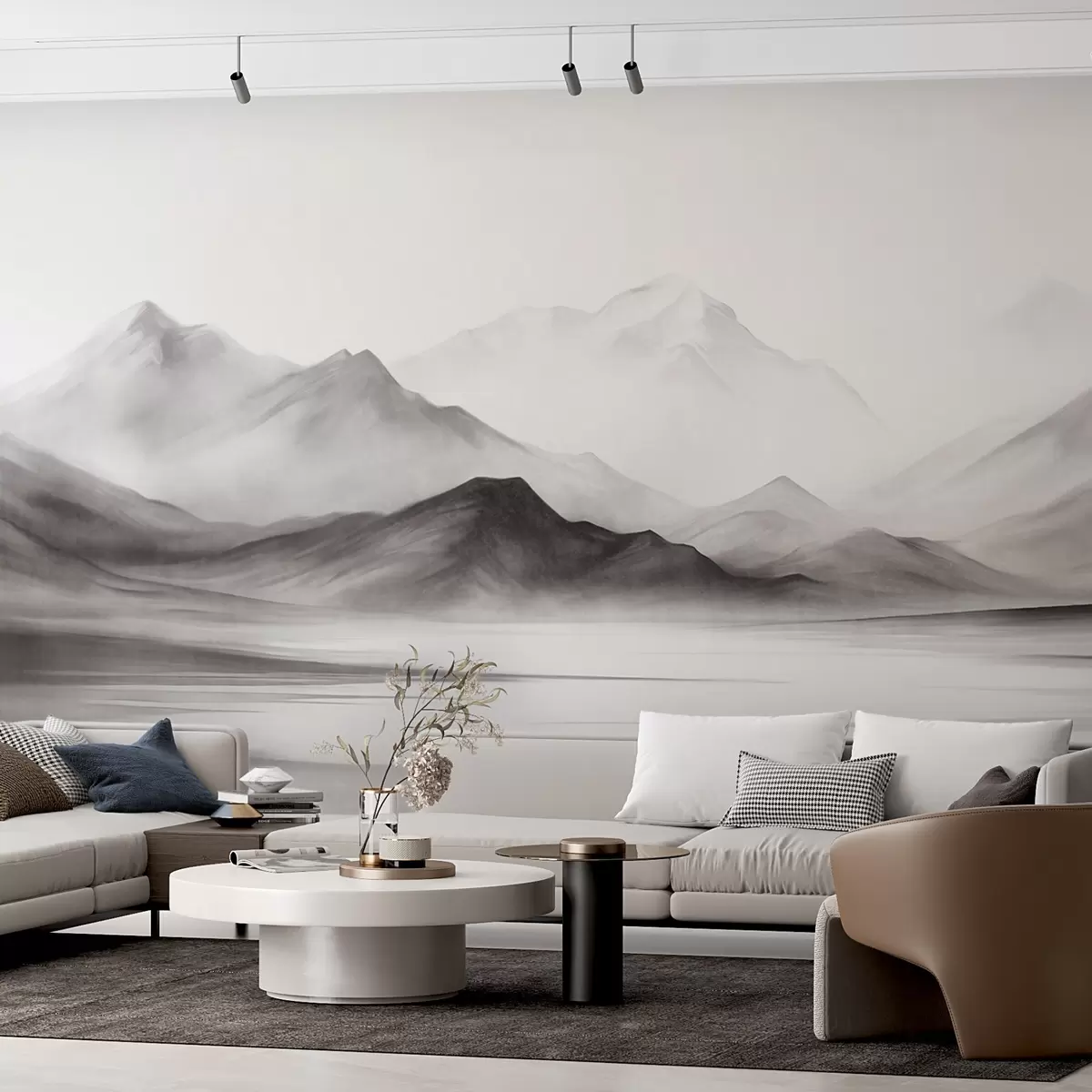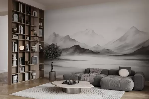 Фототапет Монохроматичен текстуриран пейзаж с мъгливи планини и езеро на преден план Nr w09555