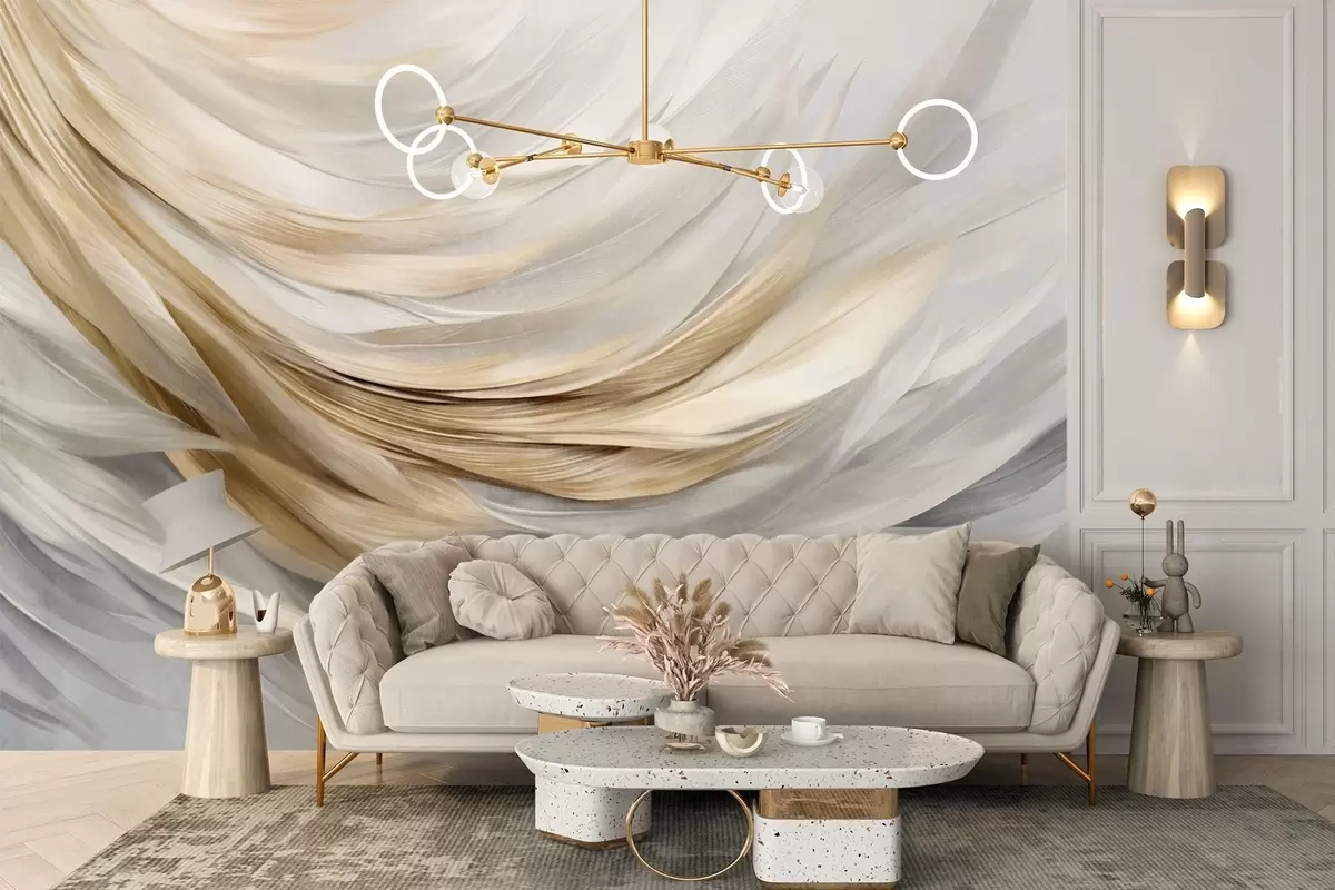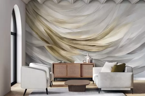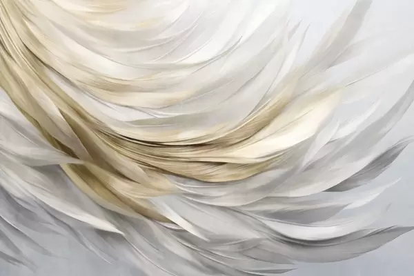 Фототапет Абстрактни текстурирани бели, сиви и жълти пера, създаващи плавен, многослоен мотив на светъл фон Nr w09557
