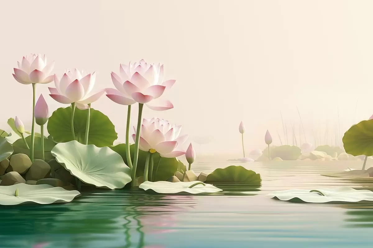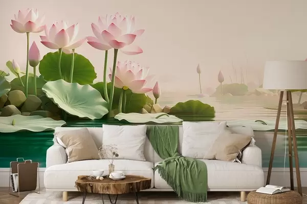Фототапет Розови лотосови цветя върху водата, спокоен тропически пейзаж Nr w09561