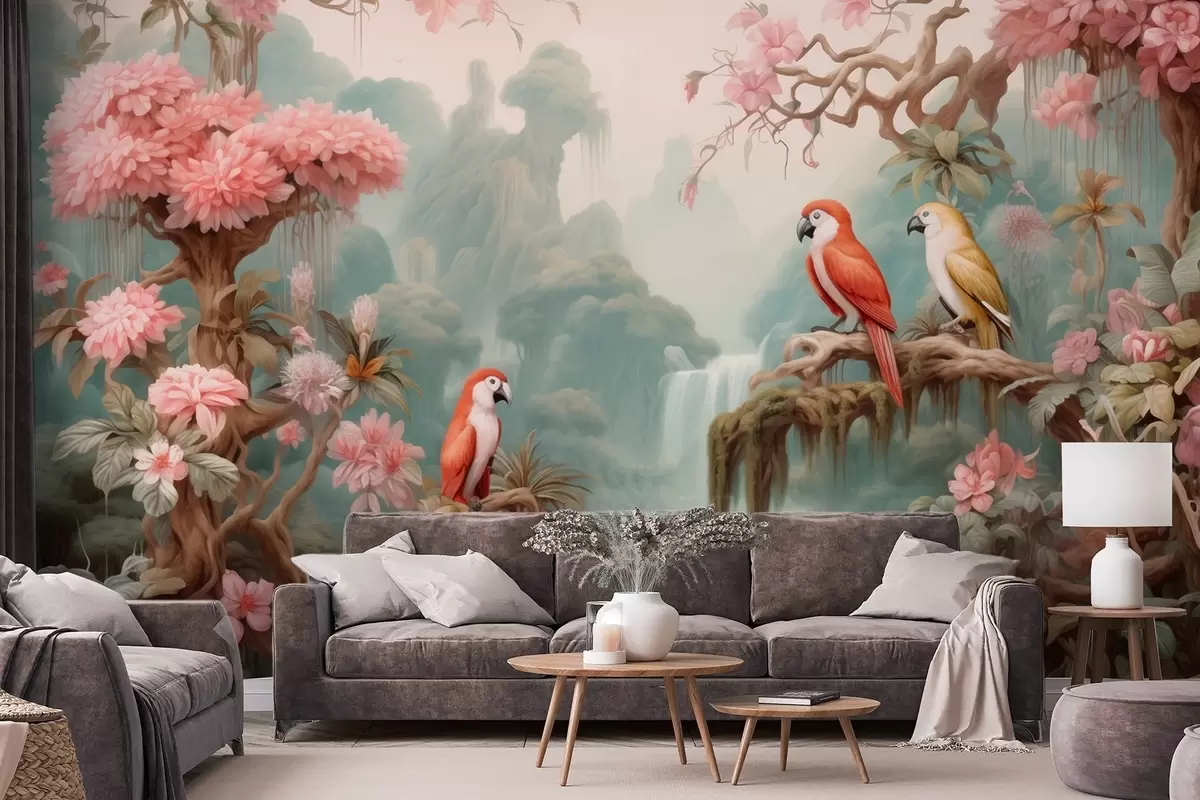 Фототапет Приказна тропическа гора с папагали, цъфтящи дървета с розови цветове и водопад Nr w09580