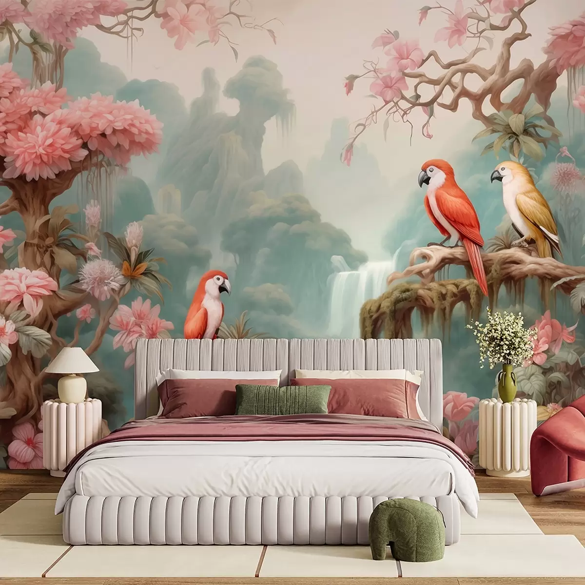 Фототапет Приказна тропическа гора с папагали, цъфтящи дървета с розови цветове и водопад Nr w09580
