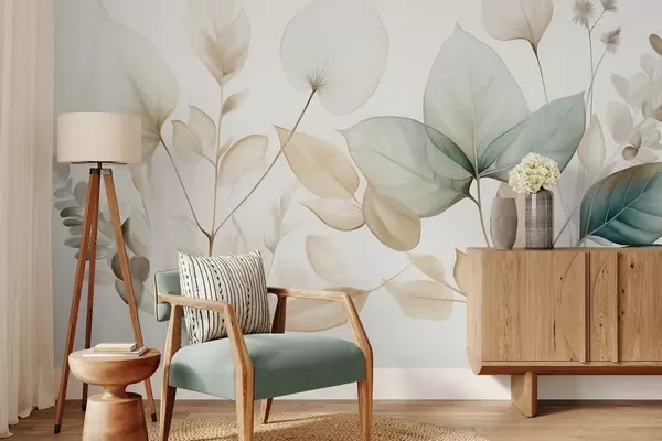 Фототапет Текстурирани прозрачни листа в приглушени бежови и тюркоазени тонове, с нежни стъбла на мек, светъл фон Nr w09583