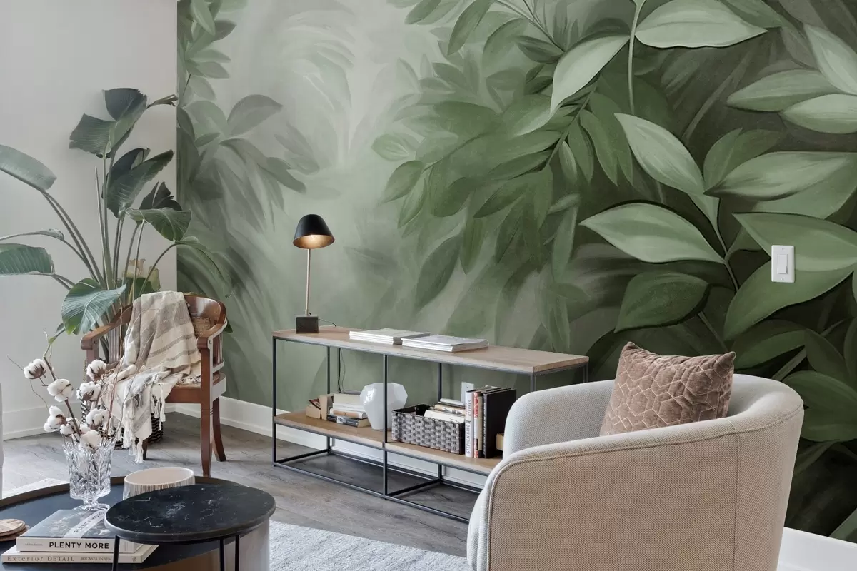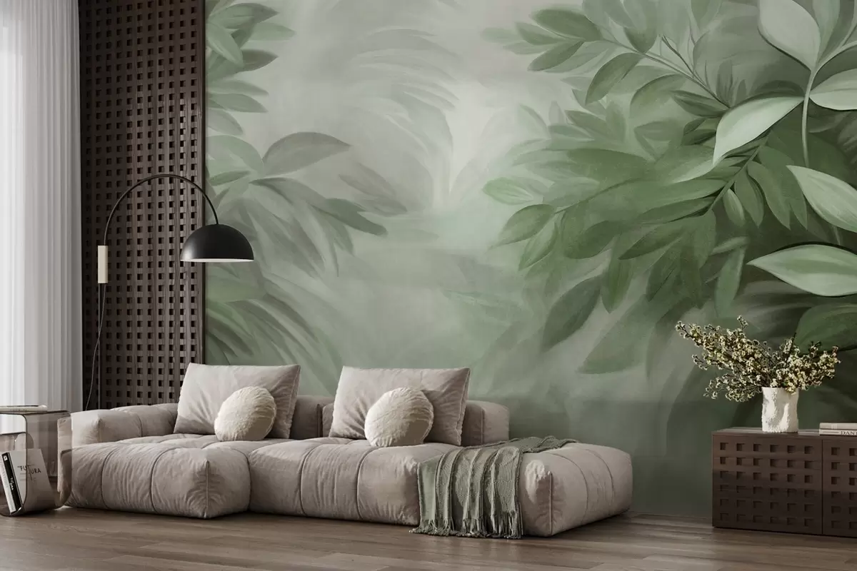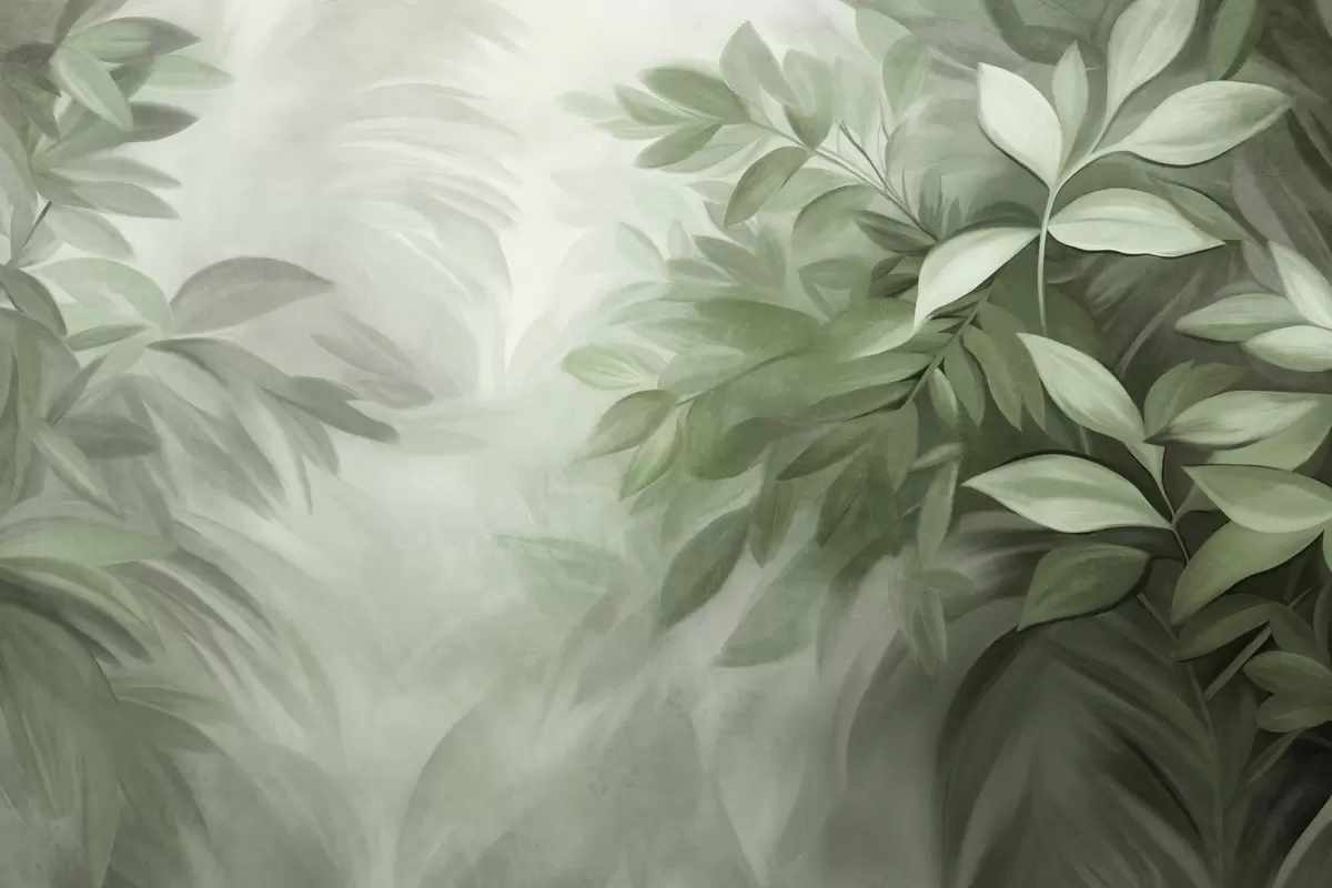 Фототапет Зелени и сиви листа с мека, размазана текстура, в живописен стил с видими четковъдни следи Nr w09584v1