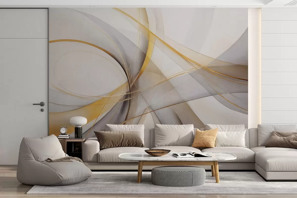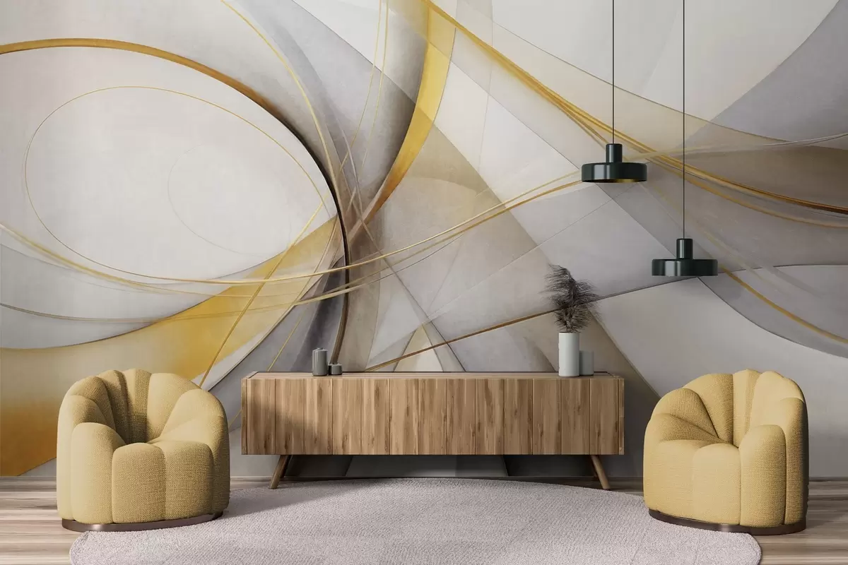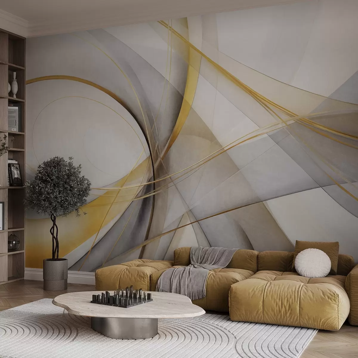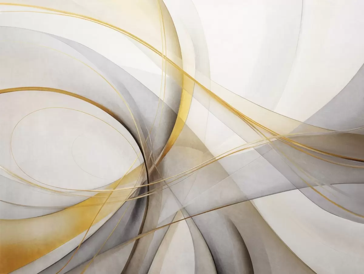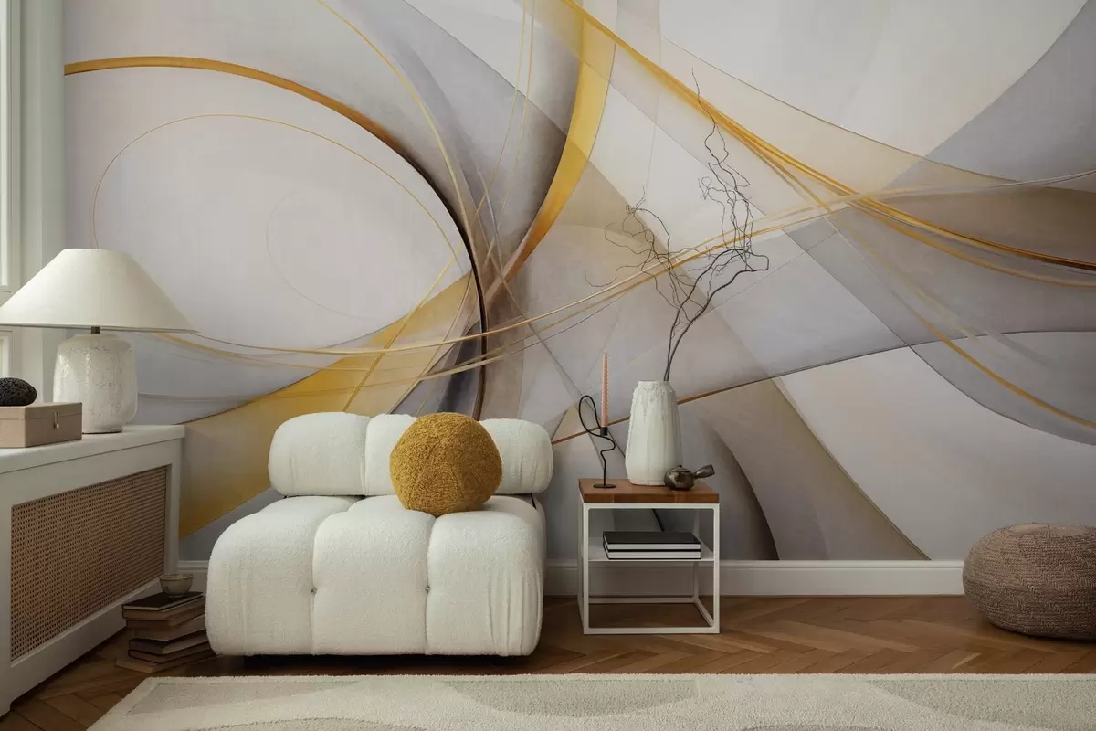 Фототапет Абстрактни плавни линии в жълто и бяло на сив фон, с усещане за движение и дълбочина, модерно изкуство Nr w09587