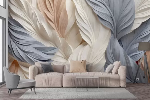 Фототапет Абстрактни, наслоени пера в кремави, бежови и светлосини нюанси, с текстуриран, органичен вид Nr w09603