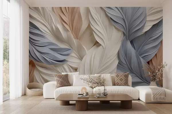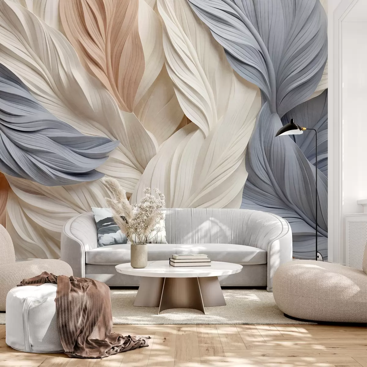 Фототапет Абстрактни, наслоени пера в кремави, бежови и светлосини нюанси, с текстуриран, органичен вид Nr w09603