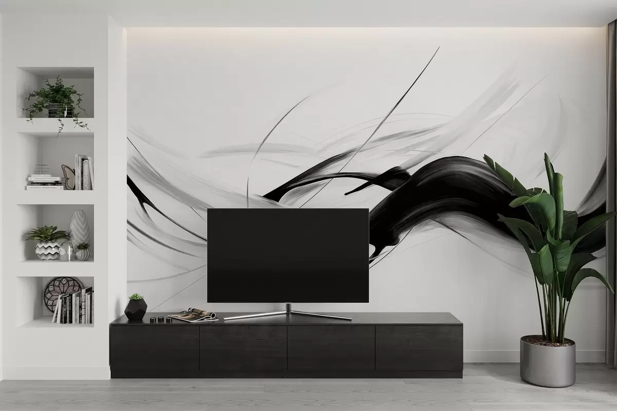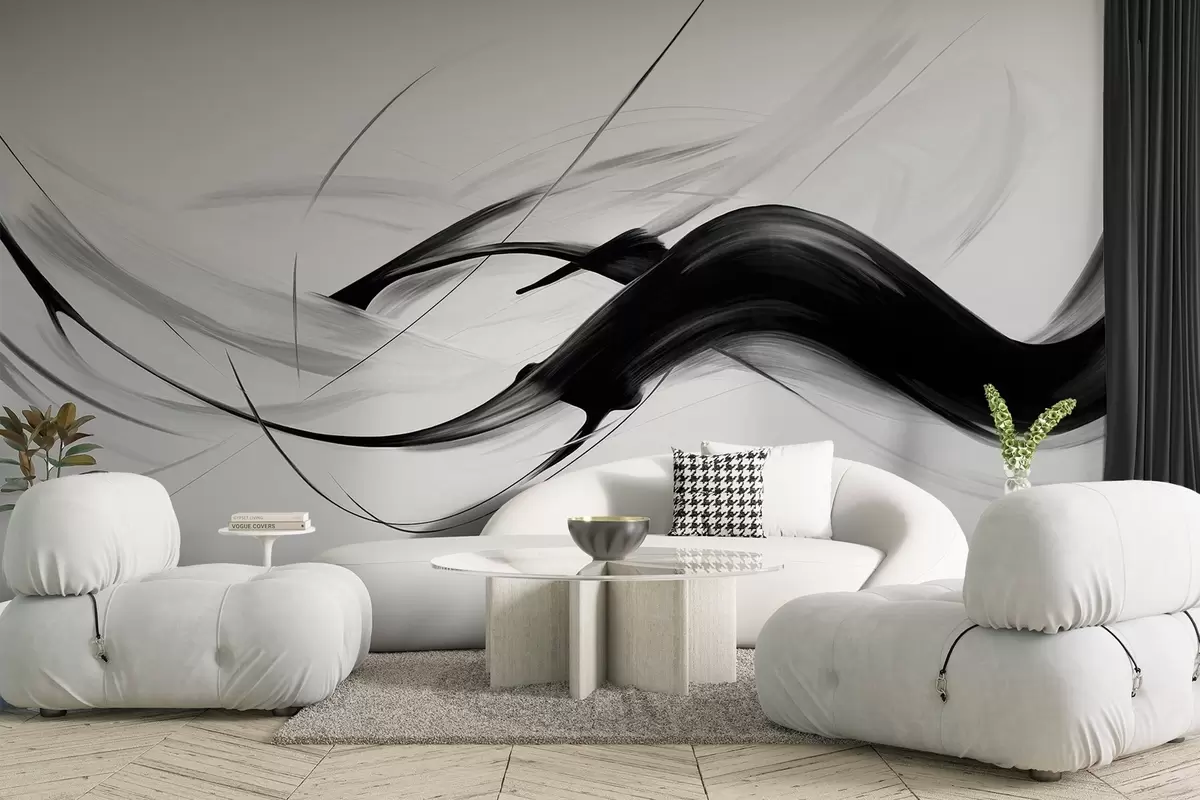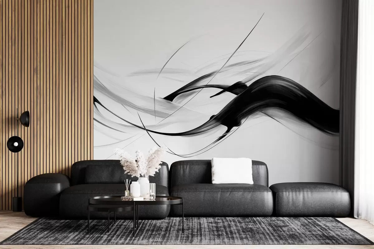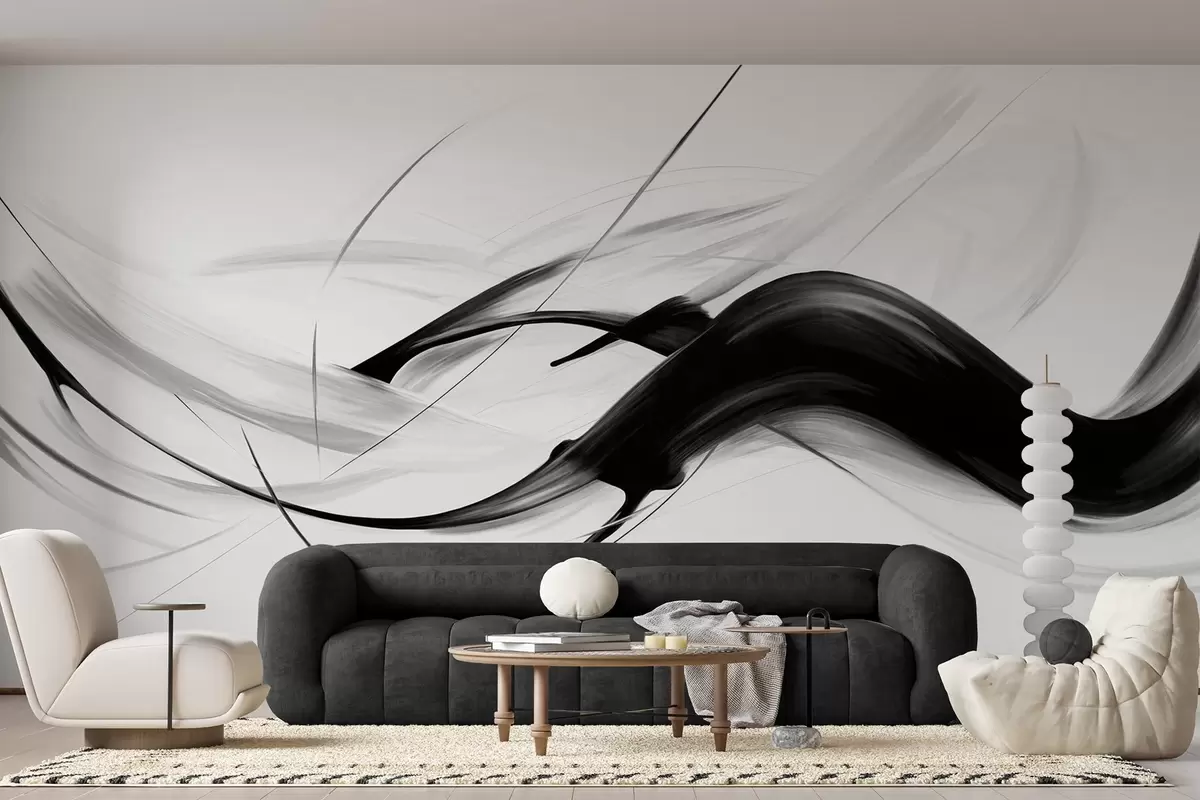 Фототапет Абстрактни черно-бели мазки с тънки линии, създаващи модерен дизайн на светъл фон Nr w09605
