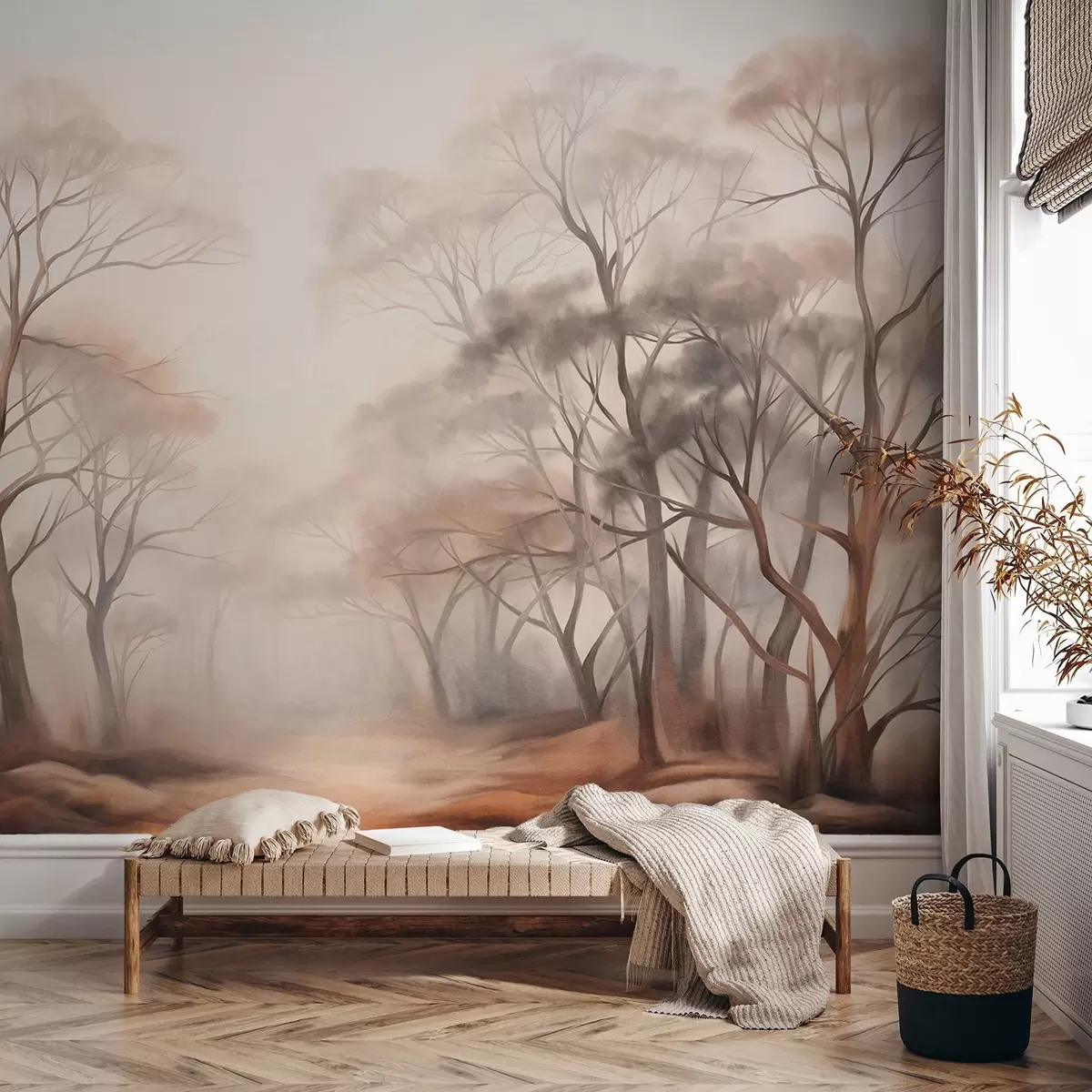 Фототапет Текстурирани дървета в мъглива гора, мъглив пейзаж с приглушени цветове и меко осветление Nr w09609