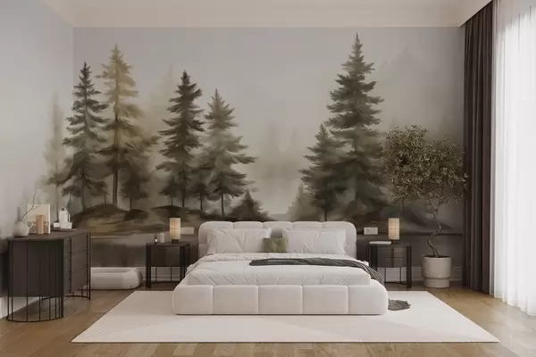 Фототапет Текстурирана мъглива гора с високи борови дървета, имитация на картина Nr w09610