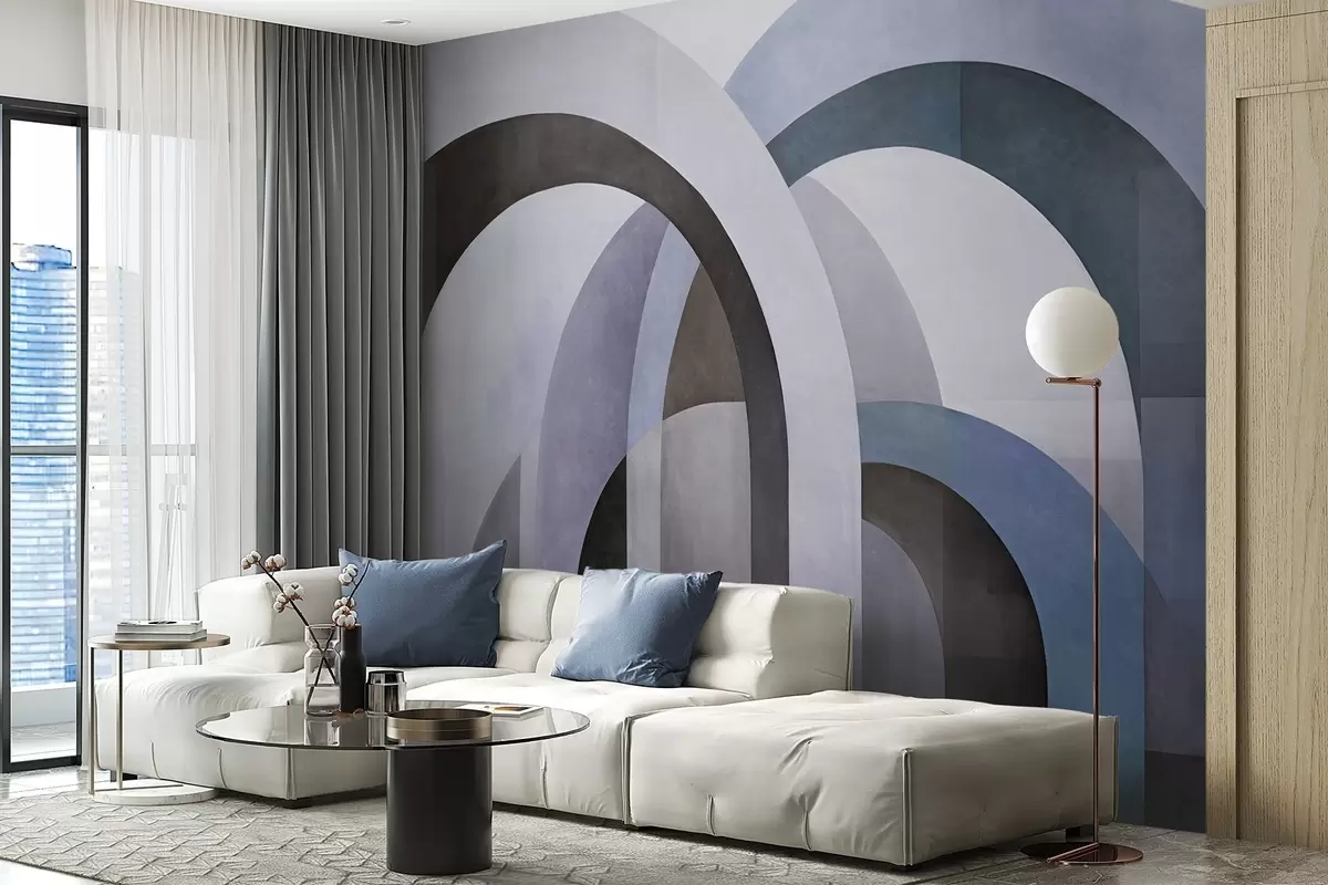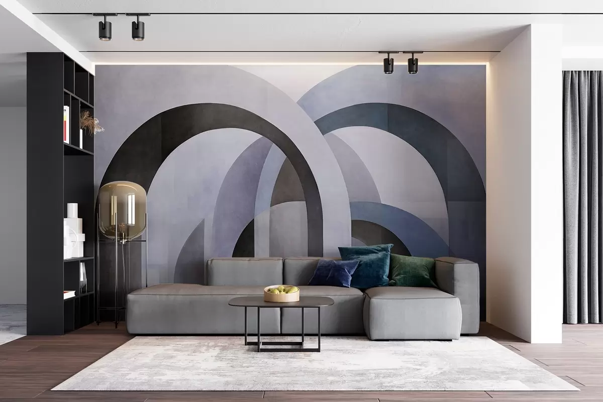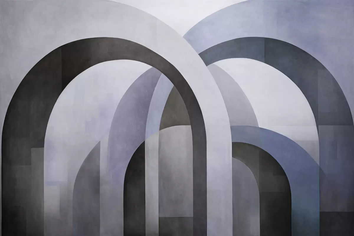 Фототапет Абстрактни текстурирани геометрични арки в синьо, черно и сиво, многослоен модерен архитектурен дизайн Nr w09611v1