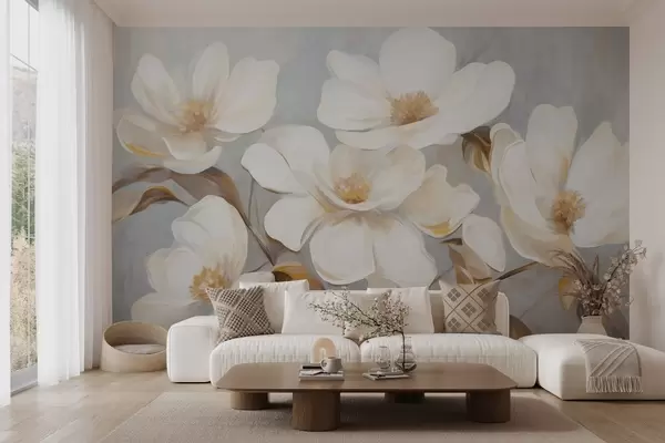 Фототапет Текстурирана имитация на няколко бели магнолиеви цветя на фона на приглушен пастелен фон Nr w09612
