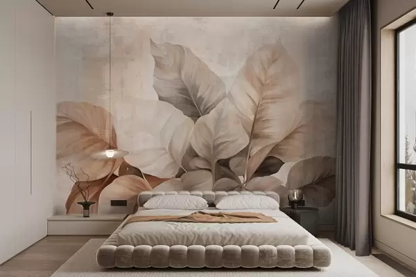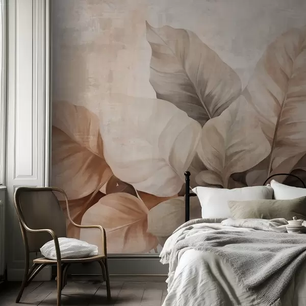 Фототапет Текстурирана имитация на големи, светлокафяви листа върху неутрален фон с фини четковъдни щрихи Nr w09614