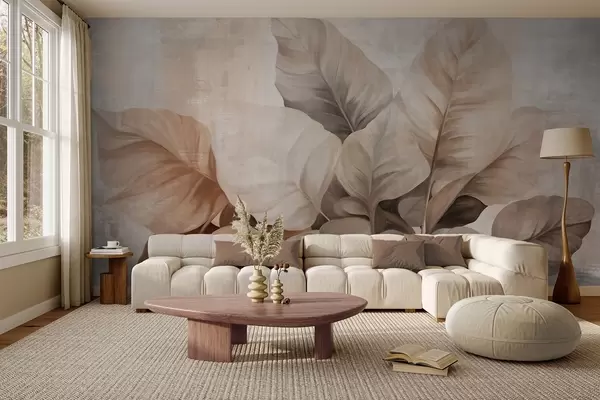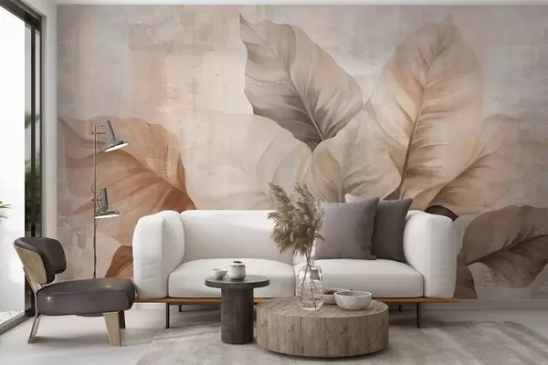 Фототапет Текстурирана имитация на големи, светлокафяви листа върху неутрален фон с фини четковъдни щрихи Nr w09614