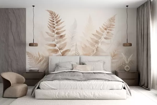 Фототапет Текстурирани изсушени листа от папрат в различни нюанси на кафяво, с мек, светъл фон в акварелен стил Nr w09615
