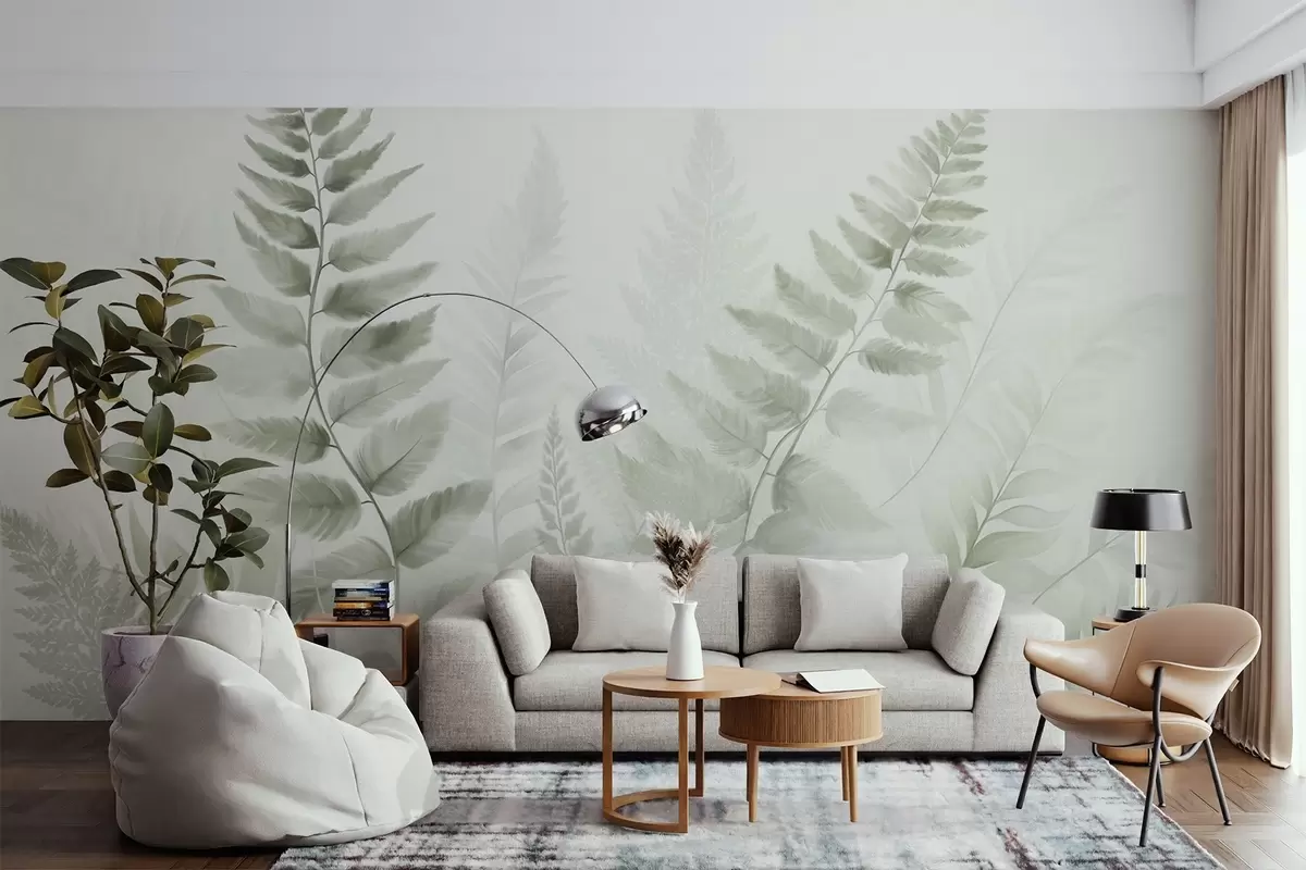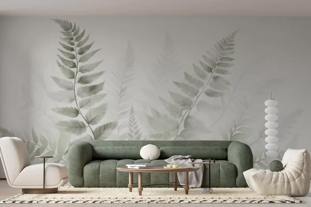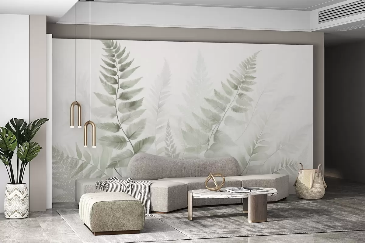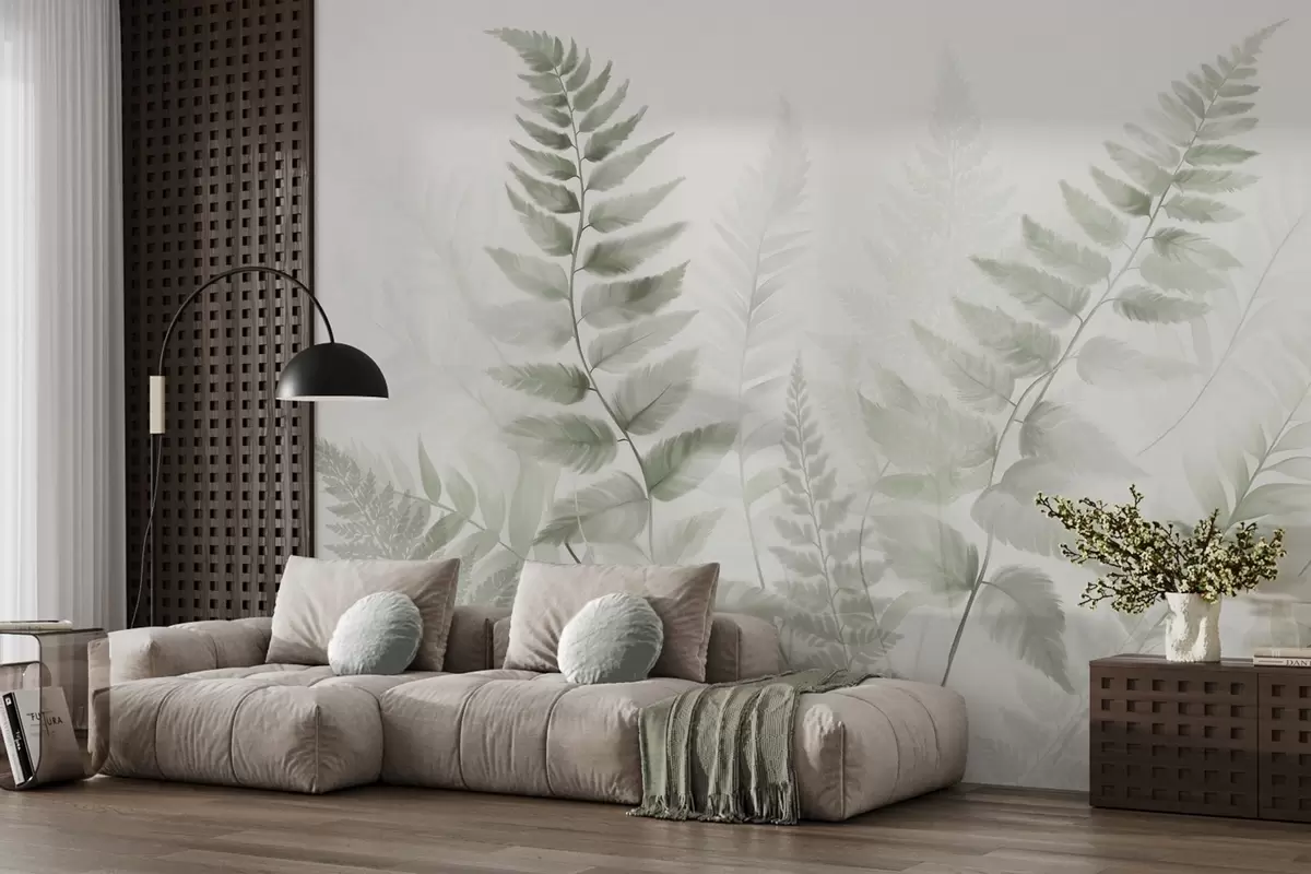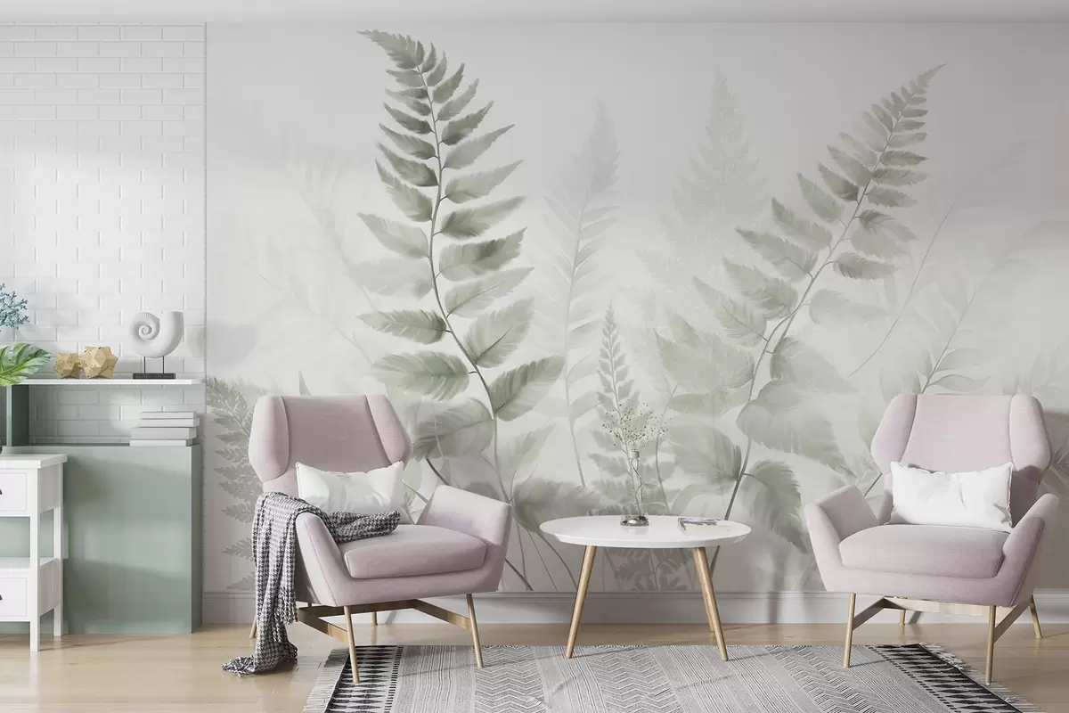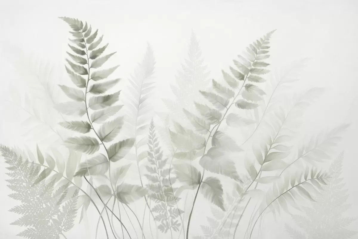 Фототапет Текстурирани изсушени листа от папрат в различни нюанси на зелено, с мек, светъл фон в акварелен стил Nr w09615v1