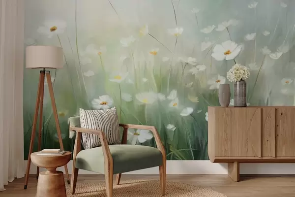 Фототапет Абстрактно поле от бели маргаритки със зелена трева и мек, мъглив фон в стил живопис Nr w09619