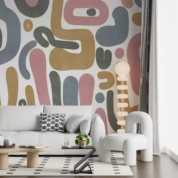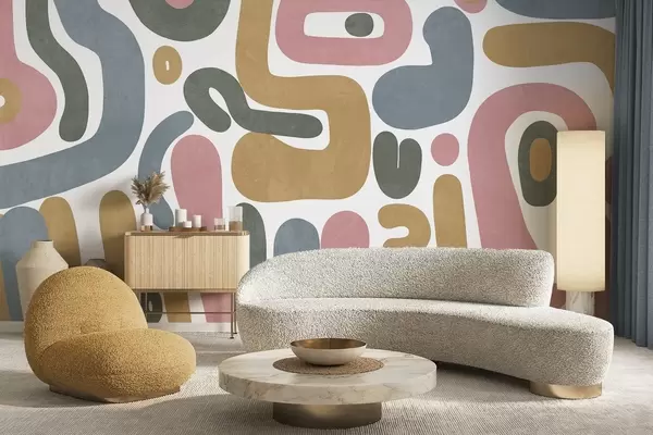 Фототапет Абстрактни текстурирани форми в пастелно розово, приглушено синьо, горчично жълто и сиво на бял фон, модерно изкуство Nr w09620