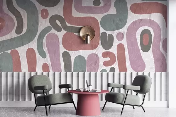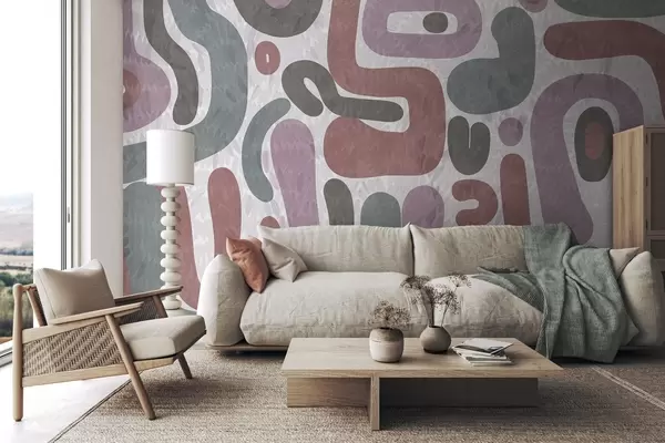 Фототапет Абстрактни текстурирани форми в приглушени розови, зелени и сиви тонове, върху текстуриран фон, модерно изкуство Nr w09622