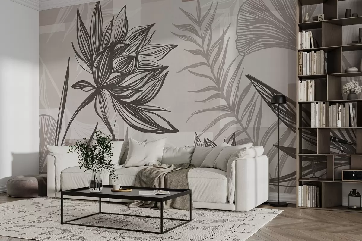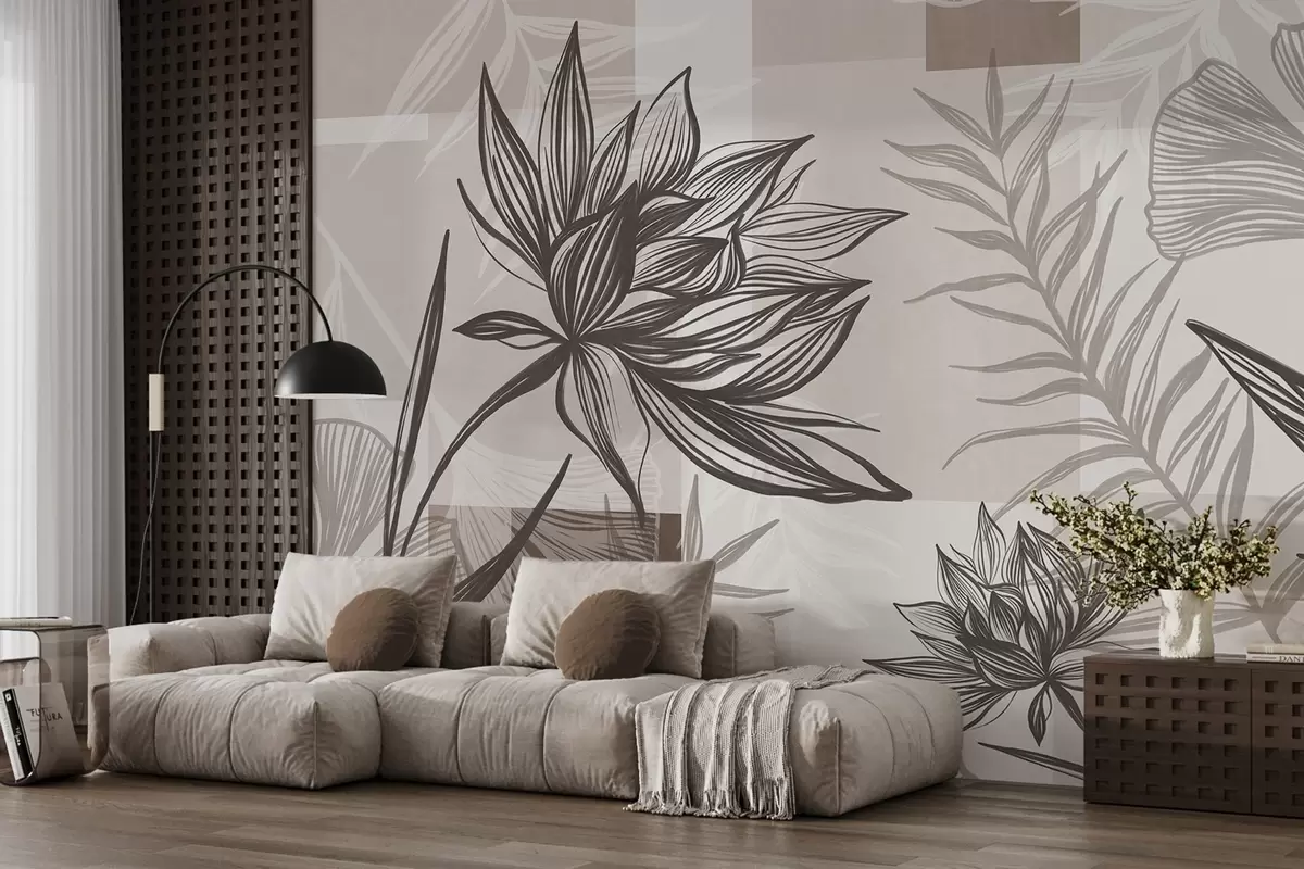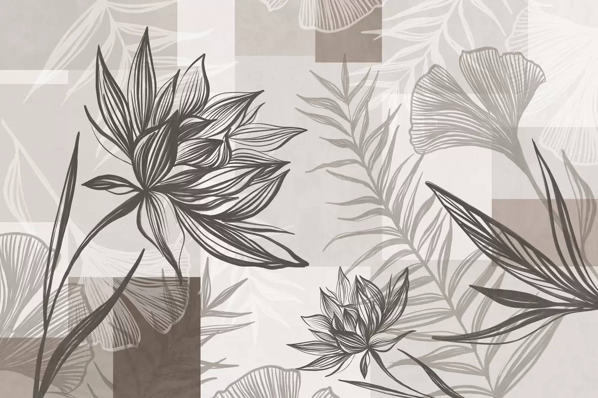 Фототапет Текстурирани стилизирани цветя и листа в кафяви и бежови нюанси, с геометричен фон, линейна графика Nr w09629