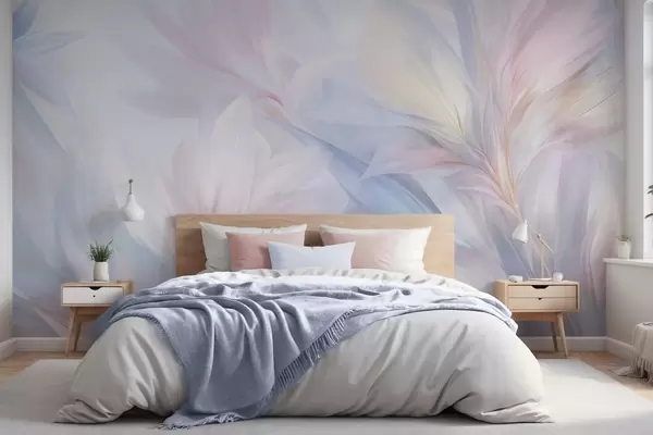 Фототапет Меки, пастелни листа и пера в нюанси на розово, синьо и жълто, абстрактен и текстуриран принт Nr w09634