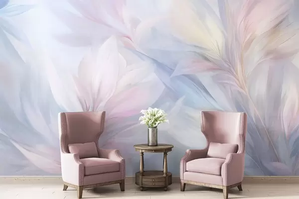 Фототапет Меки, пастелни листа и пера в нюанси на розово, синьо и жълто, абстрактен и текстуриран принт Nr w09634