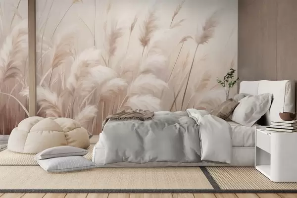 Фототапет Висока, текстурирана пампасова трева в меки, топли, неутрални тонове, с размазан, светъл фон Nr w09637