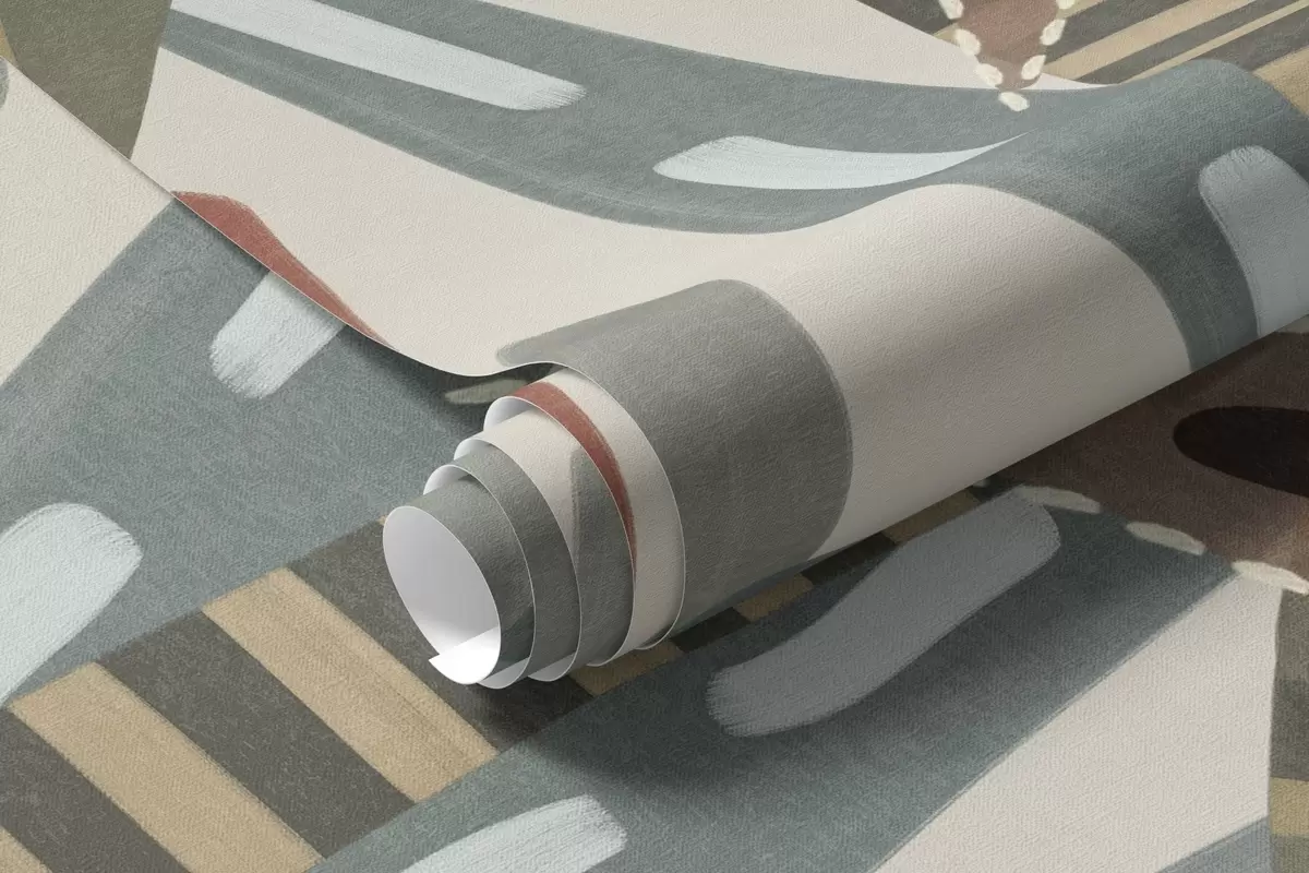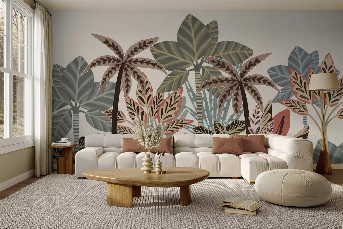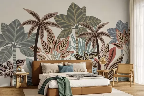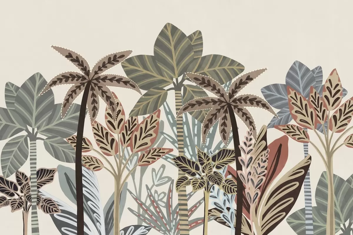 Фототапет Текстурирани тропически растения и палми с приглушени цветове в декоративен бохо стил на кремав фон Nr w09639