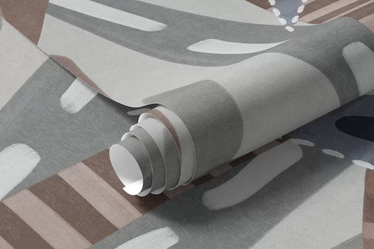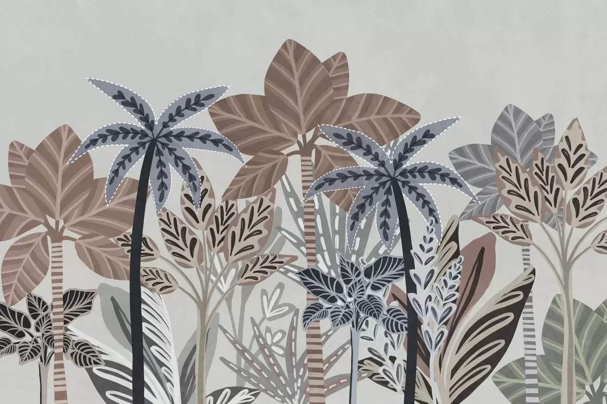 Фототапет Текстурирани тропически растения и палми с приглушени цветове в декоративен бохо стил на сив фон Nr w09639v1