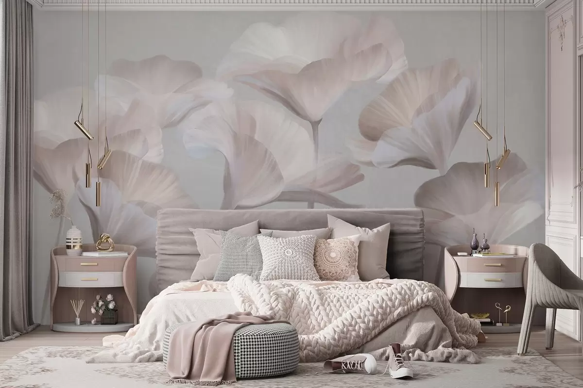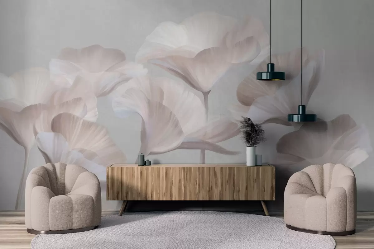 Фототапет Бледопрасковени, прозрачни лотосови цветя с нежни венчелистчета на фона на приглушено сиво. Nr w09640