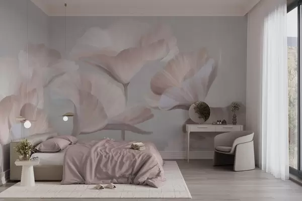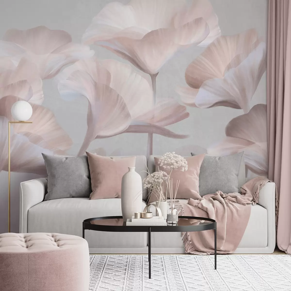 Фототапет Бледопрасковени, прозрачни лотосови цветя с нежни венчелистчета на фона на приглушено сиво. Nr w09640