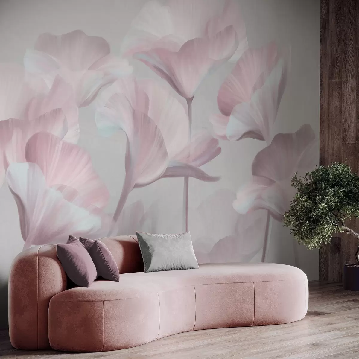 Фототапет Бледорозови прозрачни лотосови цветя с нежни венчелистчета на фона на приглушено сиво Nr w09640v1
