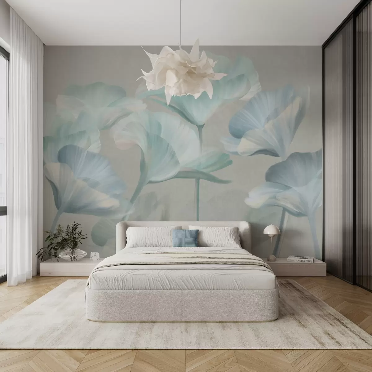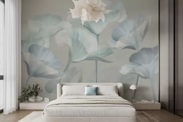 Фототапет Бледо тюркоазени, текстурирани, полупрозрачни лотосови цветя с нежни венчелистчета на фона на приглушено сиво. Nr w09640v2