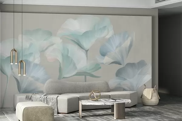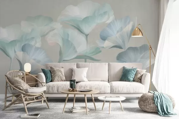 Фототапет Бледо тюркоазени, текстурирани, полупрозрачни лотосови цветя с нежни венчелистчета на фона на приглушено сиво. Nr w09640v2