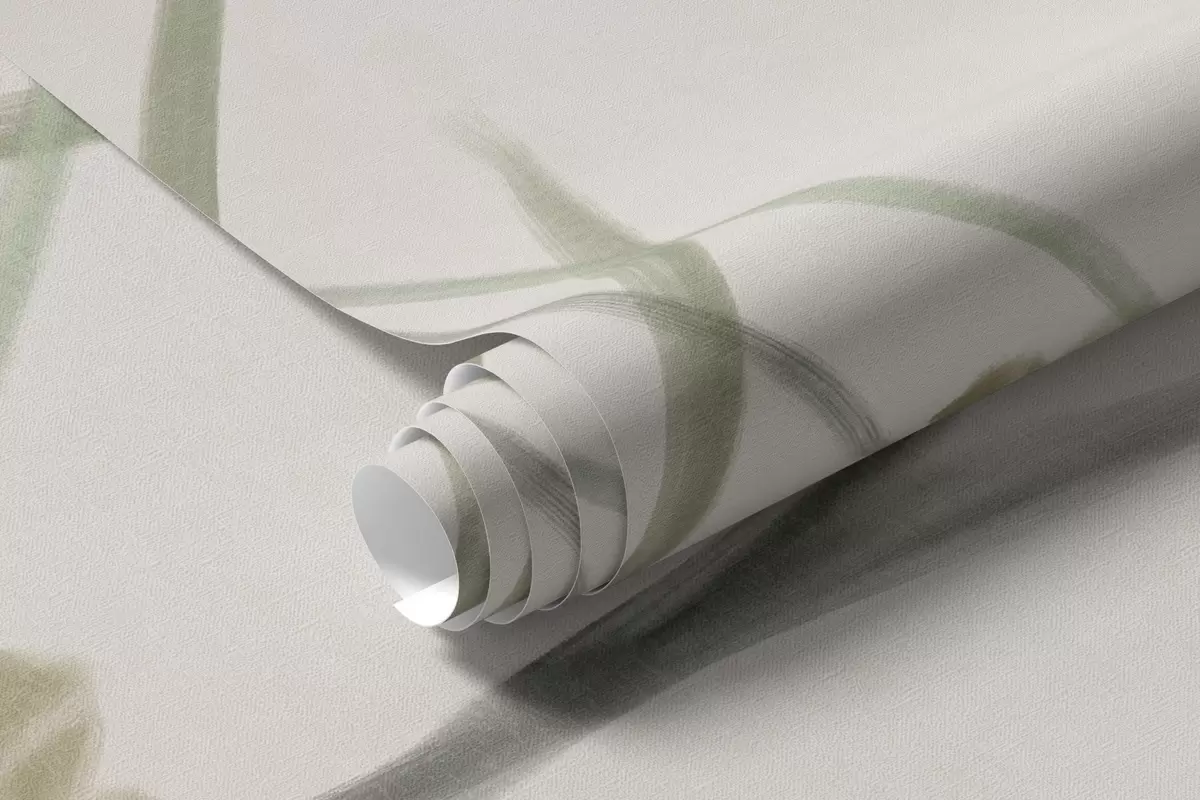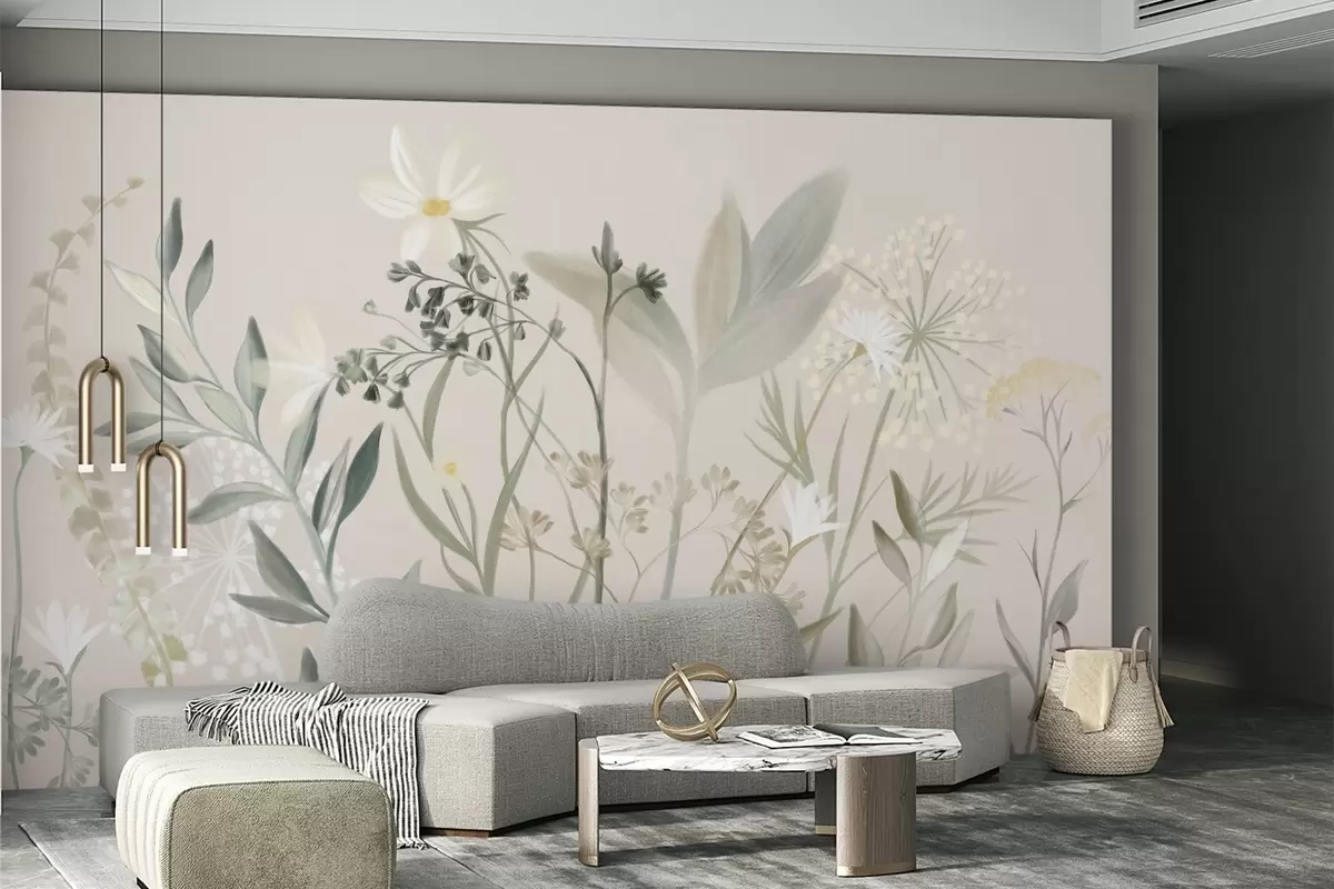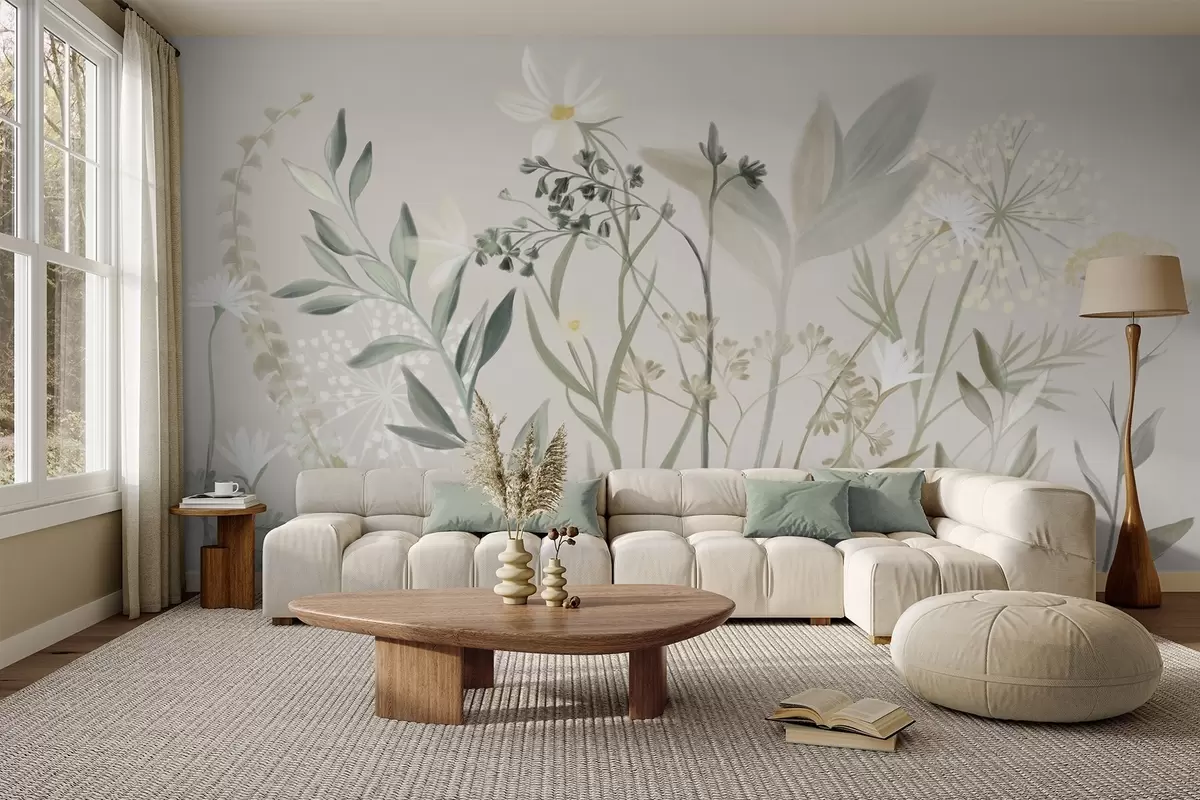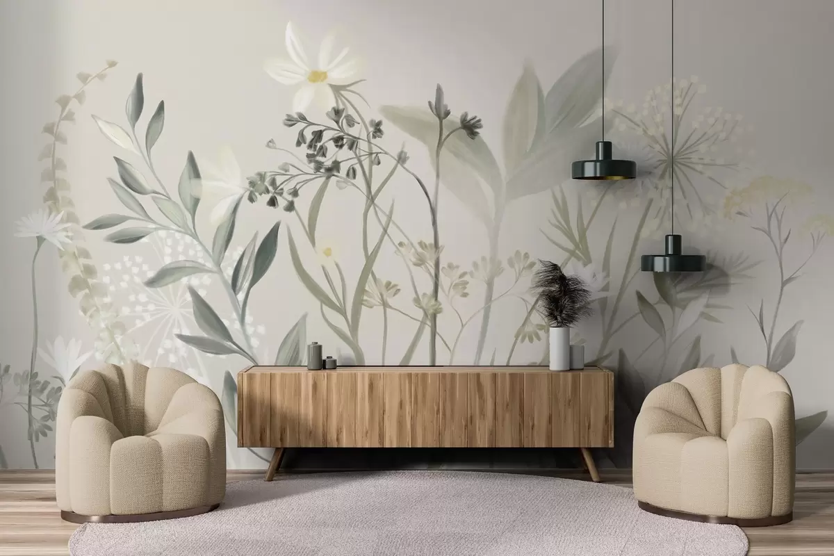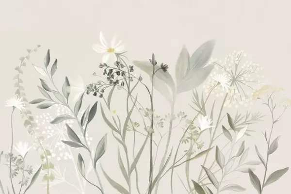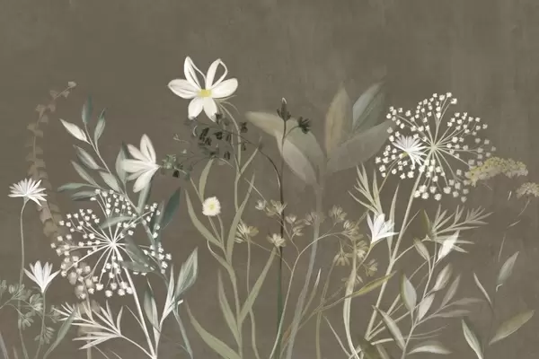 Фототапет Деликатни диви цветя и листа с нежна текстура в приглушени зелени и кремави тонове на мек бежов фон Nr w09641