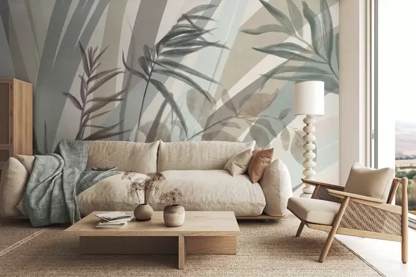 Фототапет Висока текстурирана трева и листа в приглушени земни тонове, с абстрактни линии на заден план, създаващи органичен принт. Nr w09643