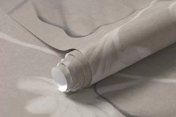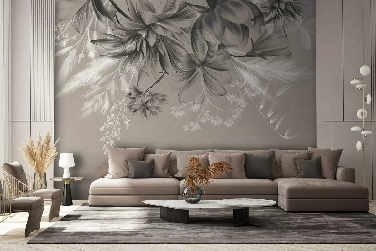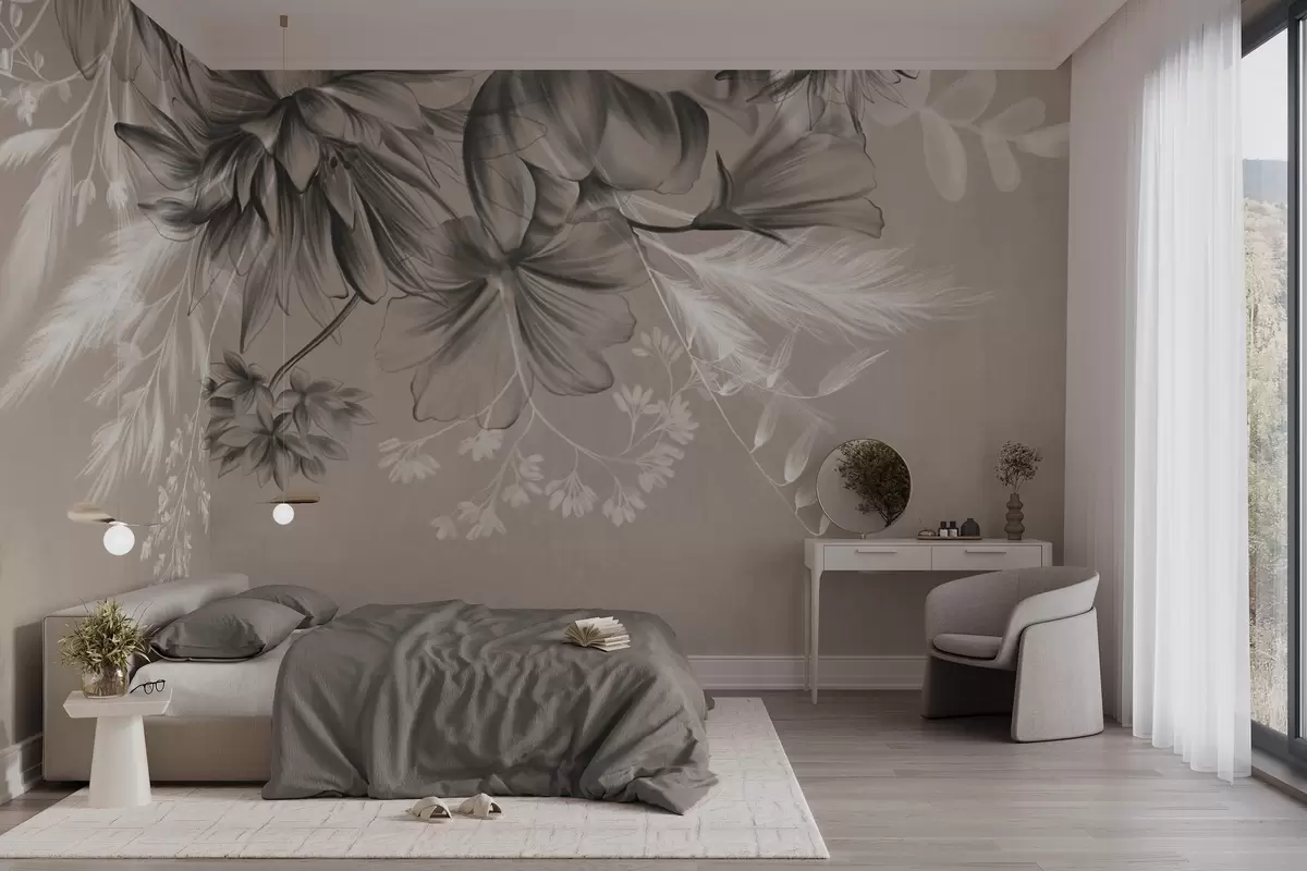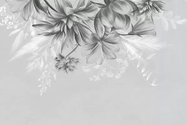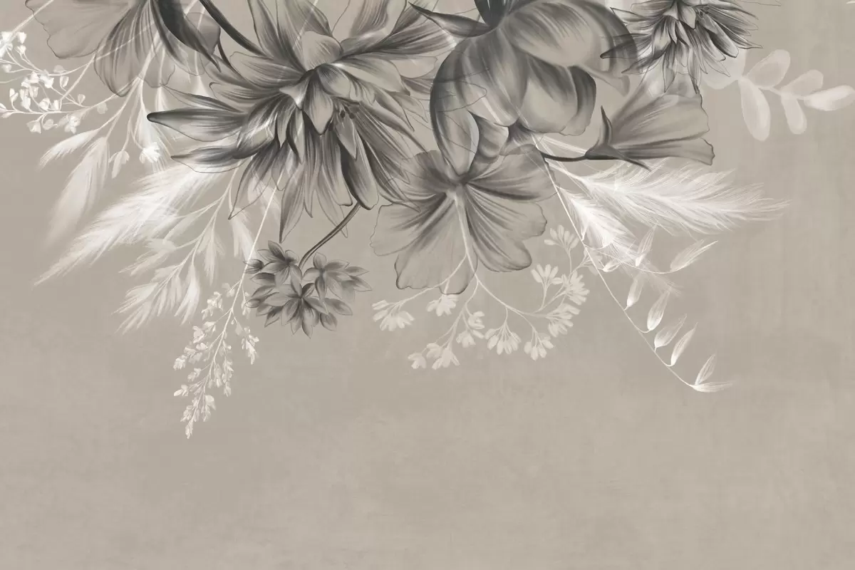 Фототапет Текстурирани цветя и папрати в нюанси на тъмно сиво и бяло на фона на приглушен бежов фон, стил на рисуване Nr w09644