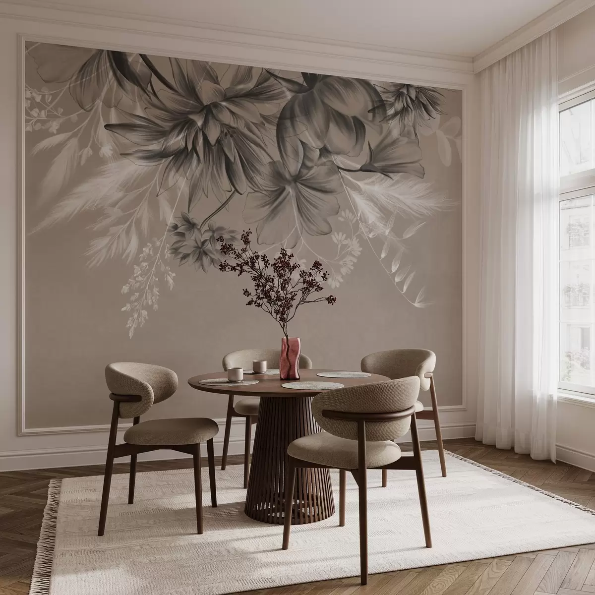 Фототапет Текстурирани цветя и папрати в нюанси на тъмно сиво и бяло на фона на приглушен бежов фон, стил на рисуване Nr w09644