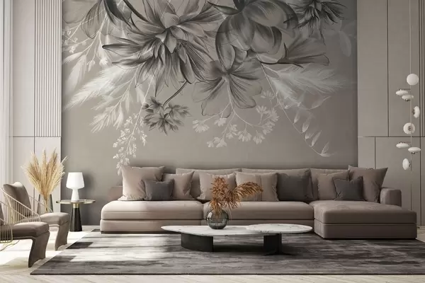 Фототапет Текстурирани цветя и папрати в нюанси на тъмно сиво и бяло на фона на приглушен бежов фон, стил на рисуване Nr w09644