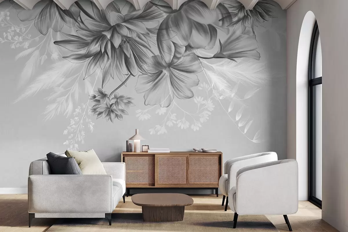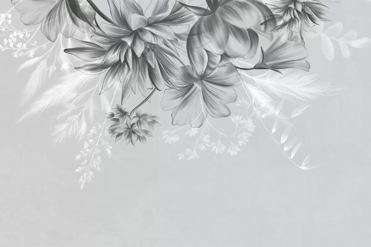 Фототапет Текстурирани цветя и папрати в нюанси на тъмно сиво и бяло на фона на приглушен сив фон, стил на рисуване Nr w09644v1