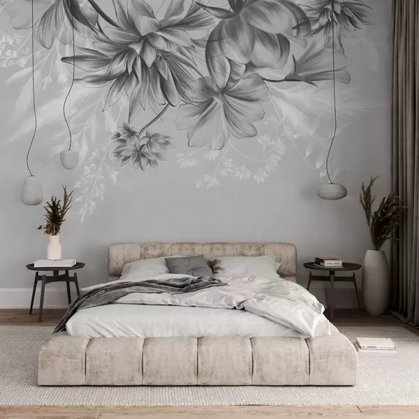 Фототапет Текстурирани цветя и папрати в нюанси на тъмно сиво и бяло на фона на приглушен сив фон, стил на рисуване Nr w09644v1