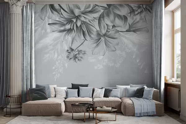 Фототапет Текстурирани цветя и папрати в нюанси на тъмно сиво и бяло на фона на приглушен сив фон, стил на рисуване Nr w09644v1