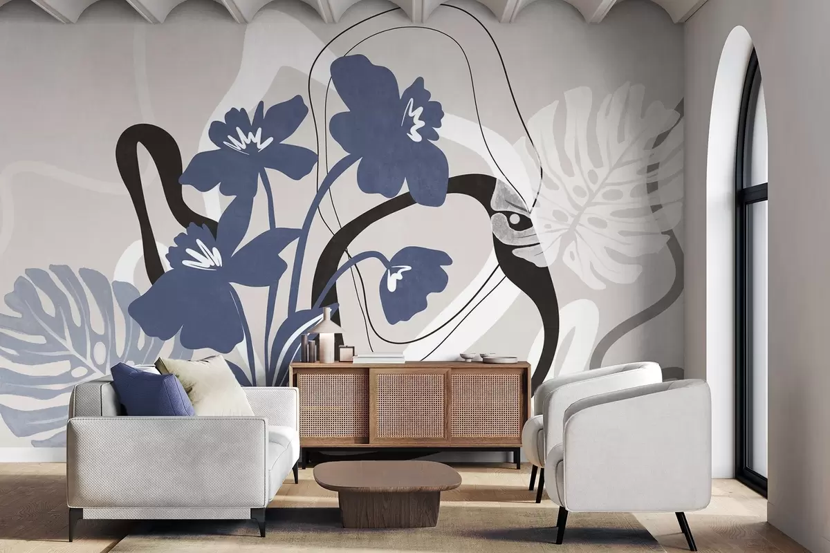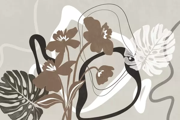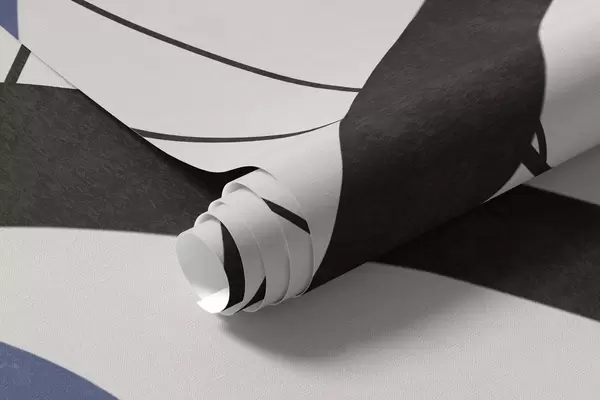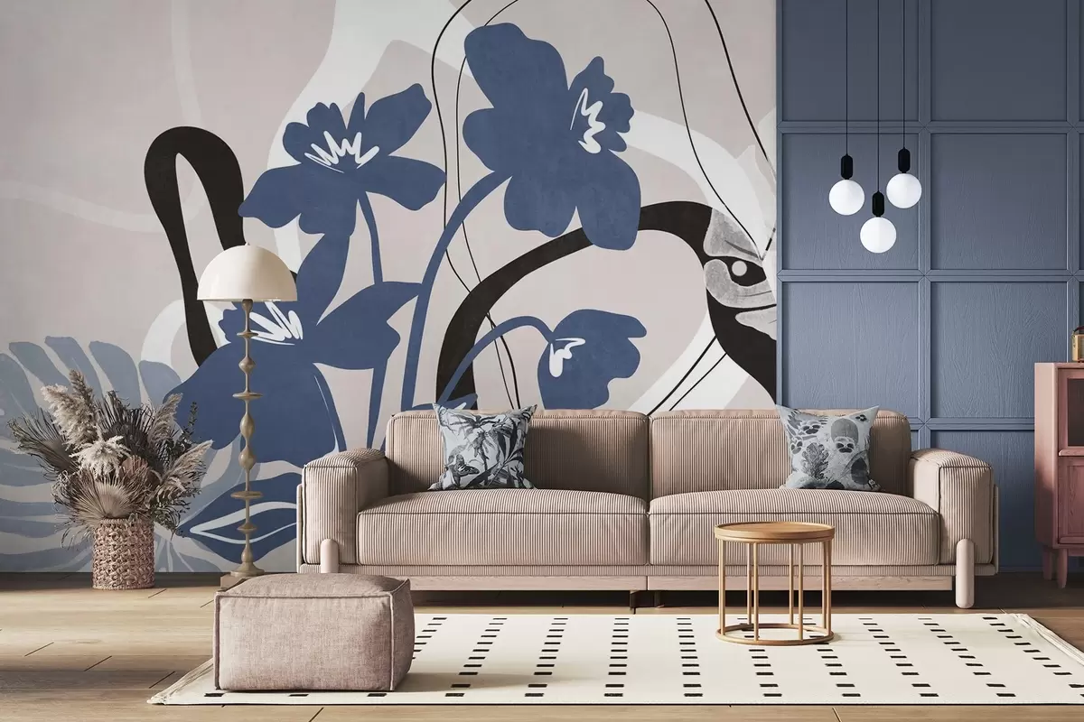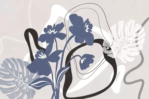 Фототапет Абстрактни сини цветя с текстура, с бели и черни форми на светлобежов фон, минималистично изкуство Nr w09645