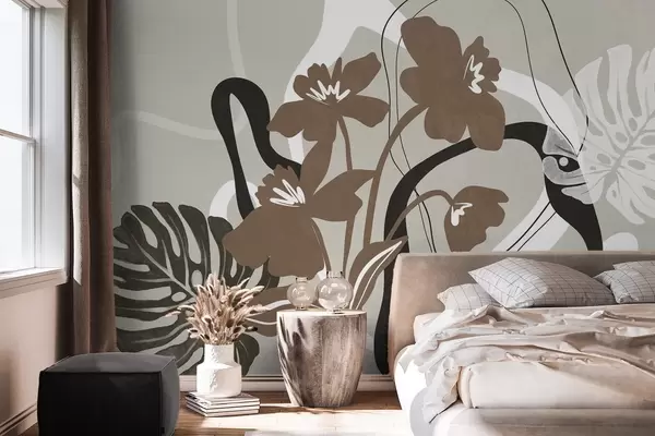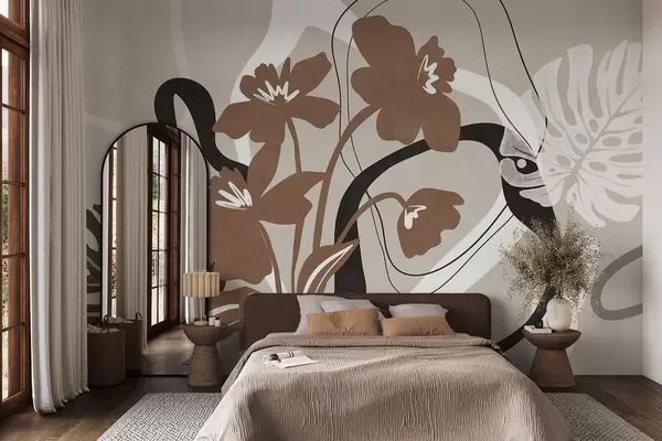 Фототапет Абстрактни кафяви цветя с бяла и черна текстура на бежов фон, минималистично изкуство Nr w09645v1