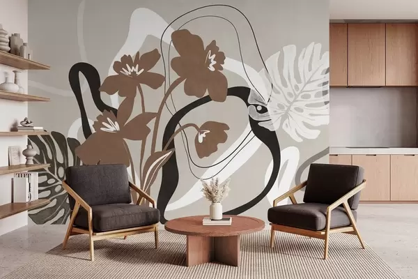 Фототапет Абстрактни кафяви цветя с бяла и черна текстура на бежов фон, минималистично изкуство Nr w09645v1