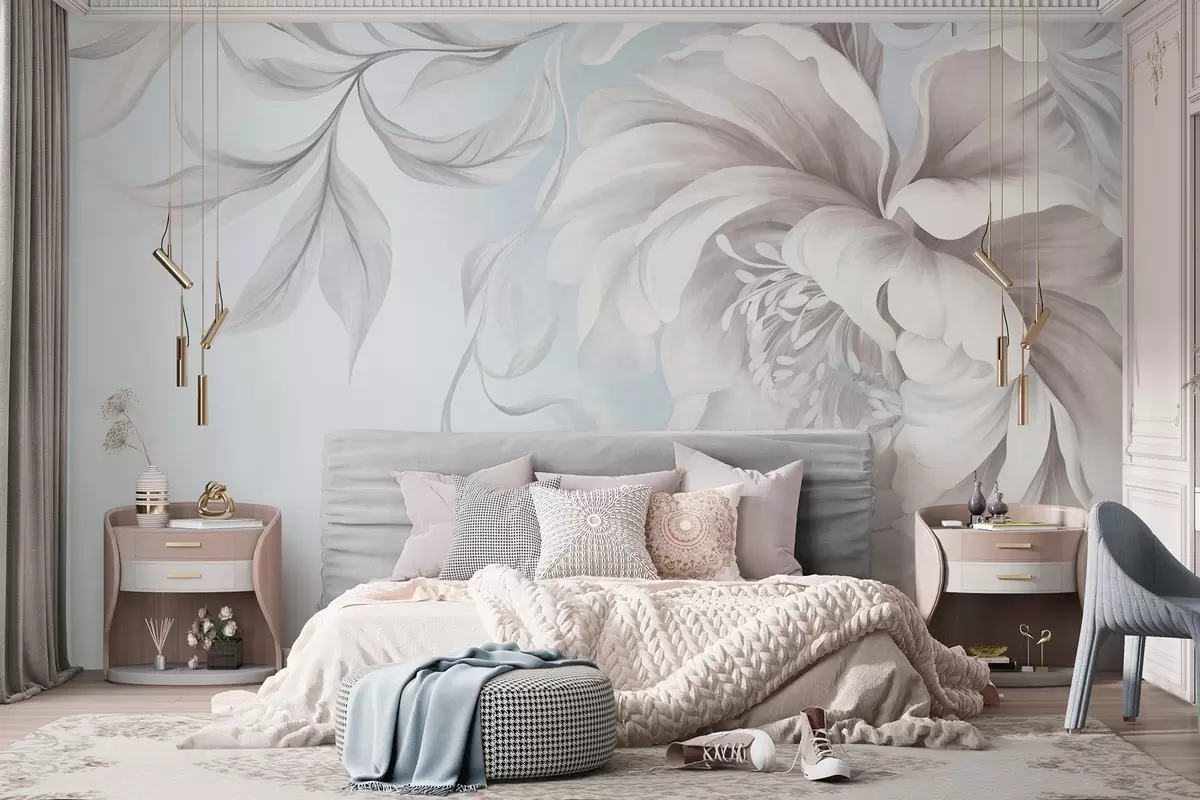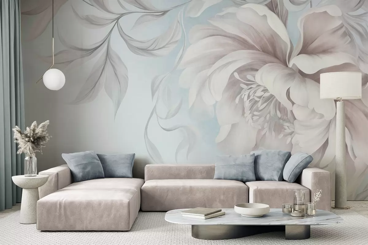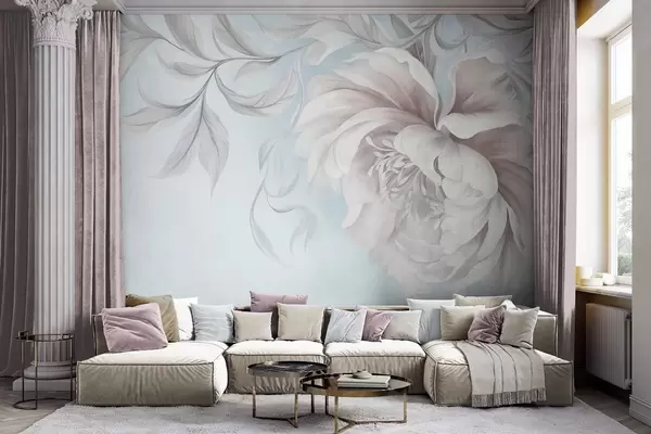Фототапет Голям божур с релефна текстура, нежни венчелистчета и сиви листа, изобразен в мек стил Nr w09647v1