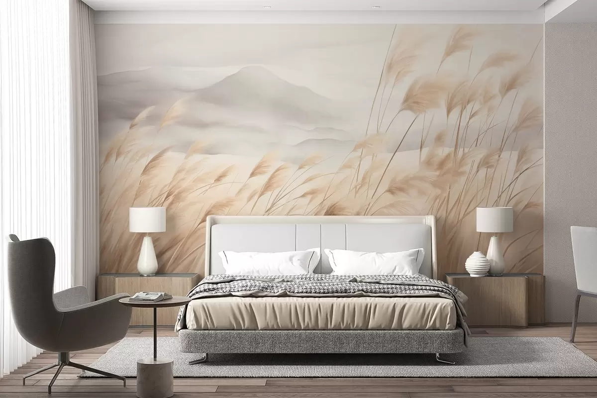 Фототапет Текстуриран планински пейзаж с висока, суха трева под мъгливо небе Nr w09649