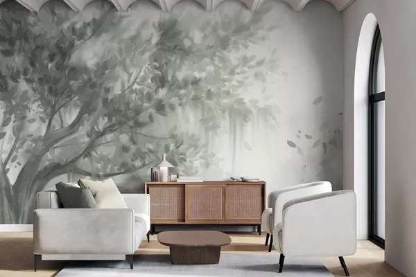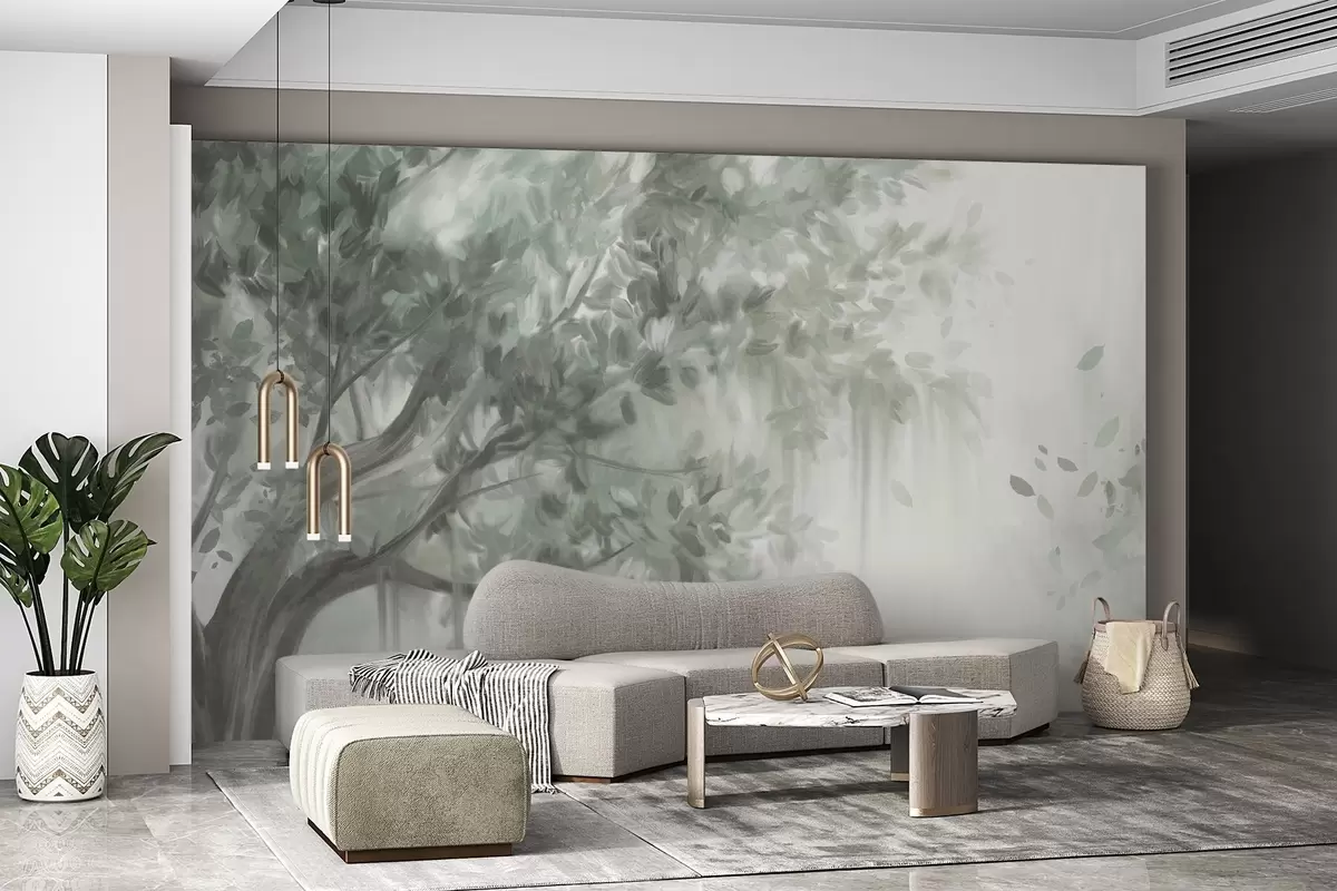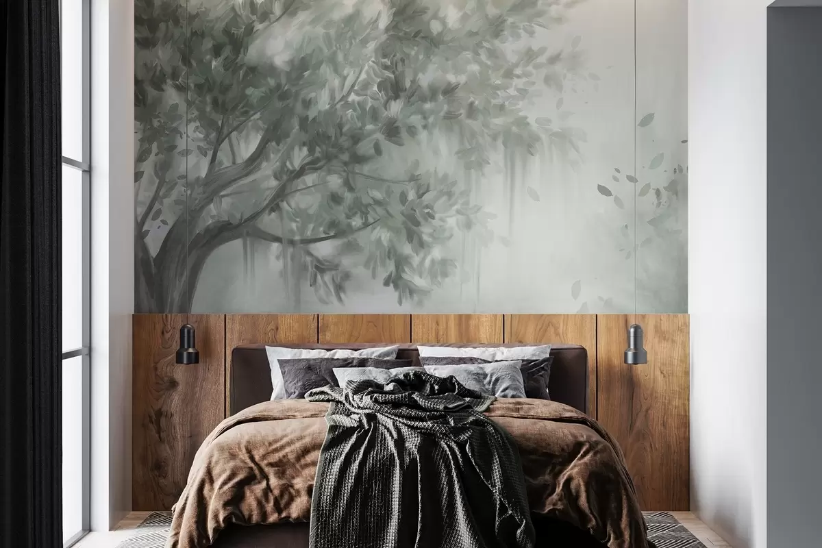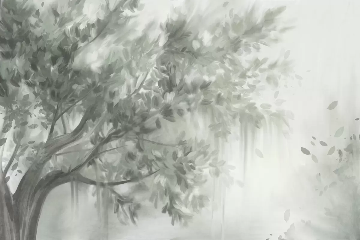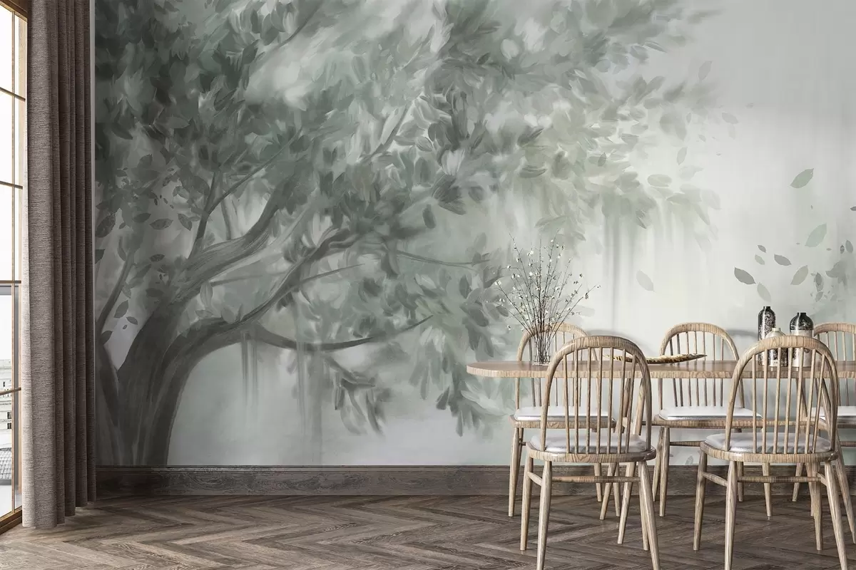 Фототапет Текстурирано дърво със зелени листа и клони, с мек, замъглен фон Nr w09650v1