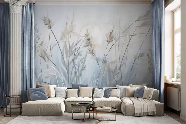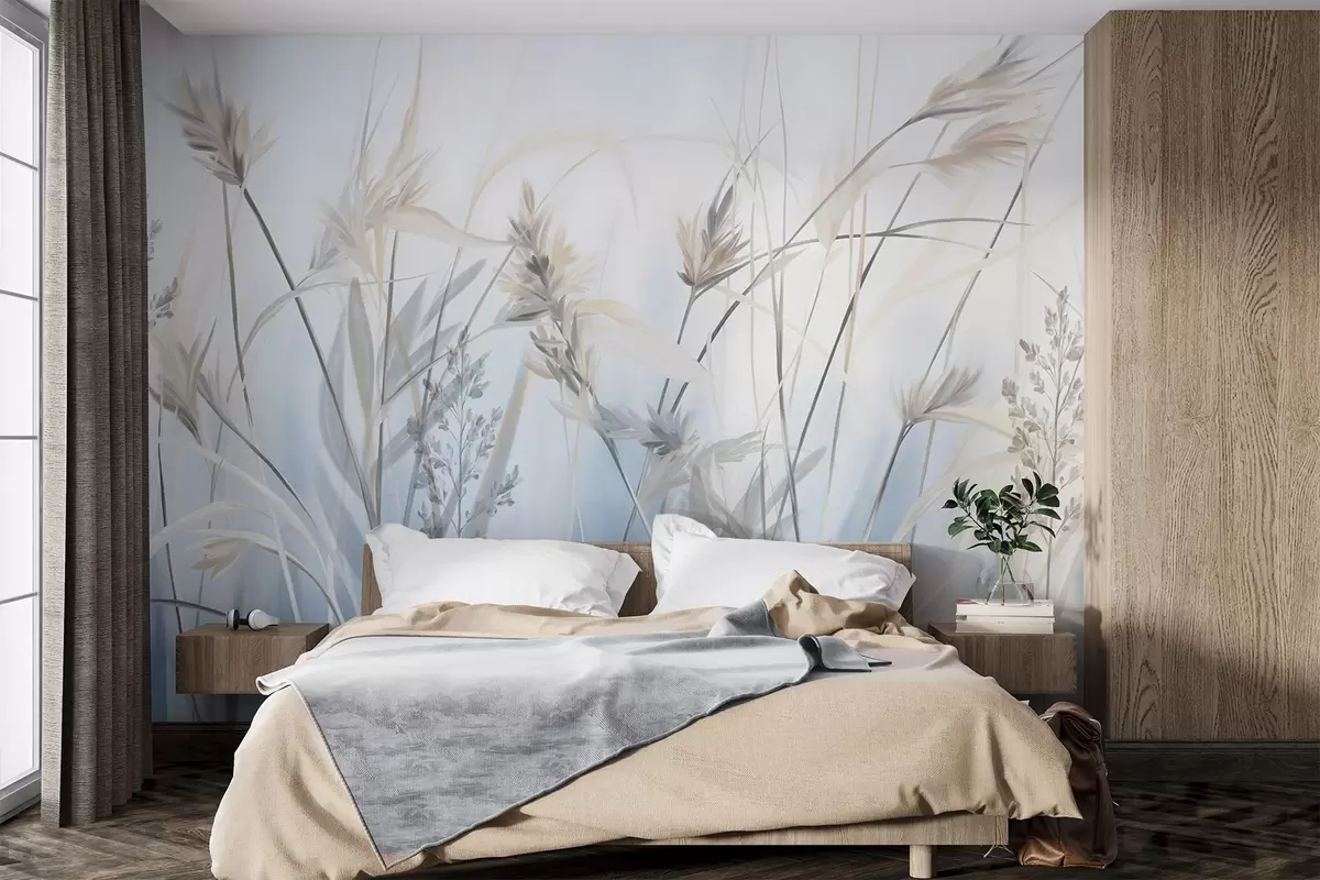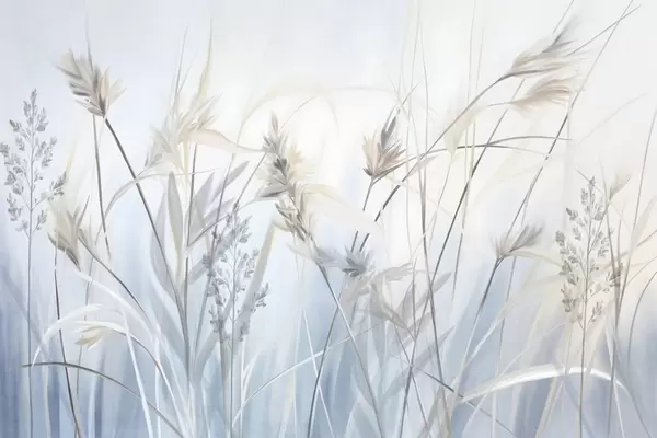 Фототапет Високи, сухи стъбла от трева с пернати върхове в приглушени тонове, мек, мъглив син и бял фон Nr w09652