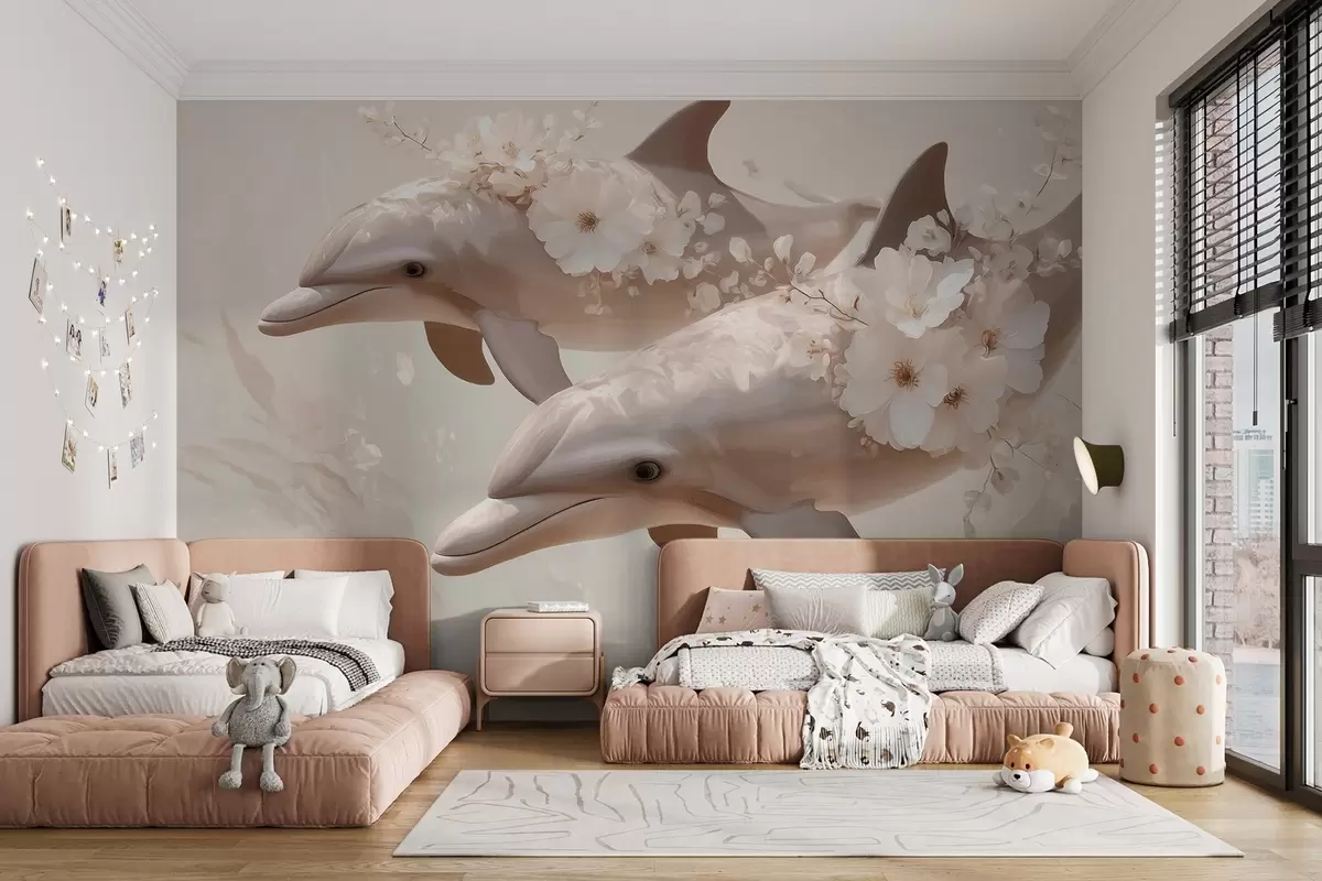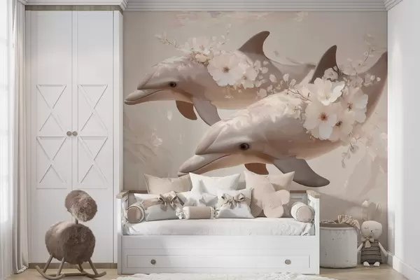 Фототапет Делфини в океан от нежни цветя и мека светлина Nr w09666